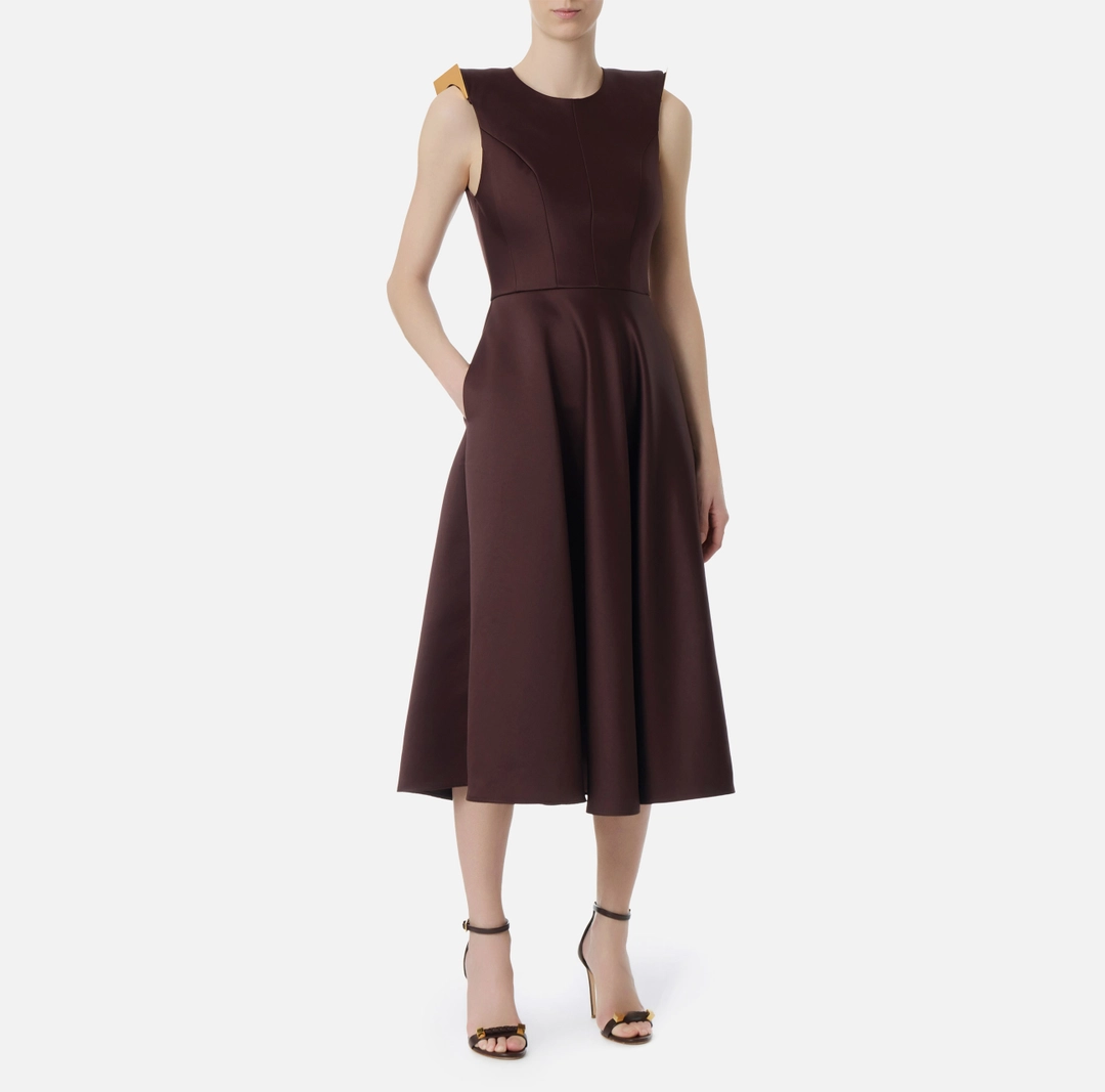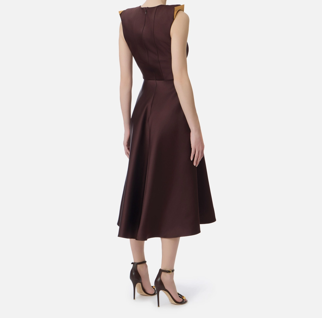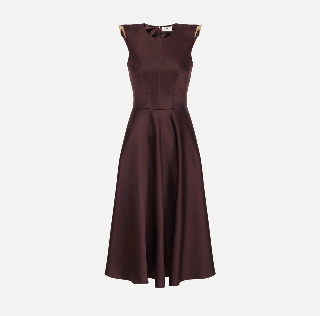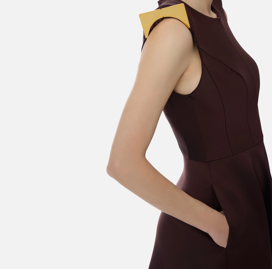 Abito in duchesse. Il vestito è smanicato e ha gonna a ruota per un volume protagonista. Focus sulle spalle, strutturate e chiuse dalla placca geometrica in metallo dorato a donare una luce inedita. Vestibilità regular.