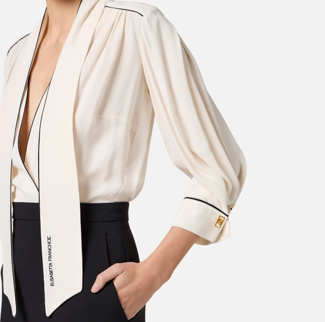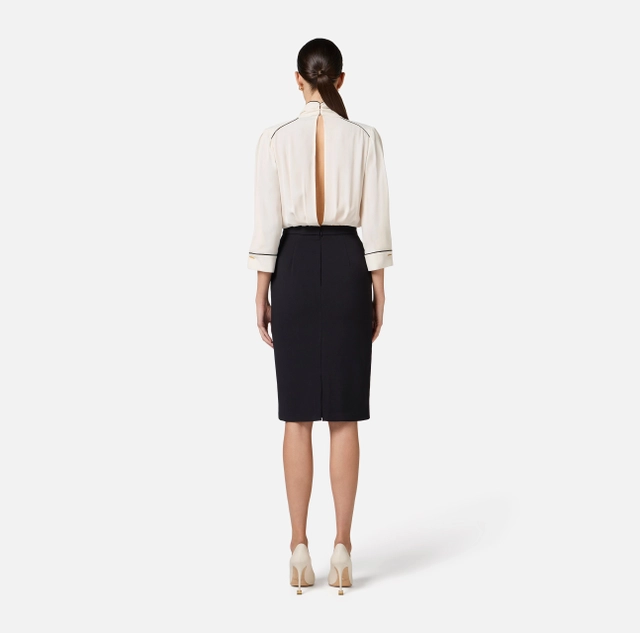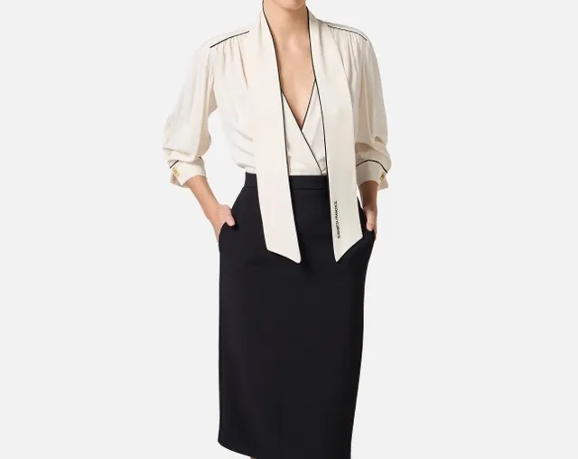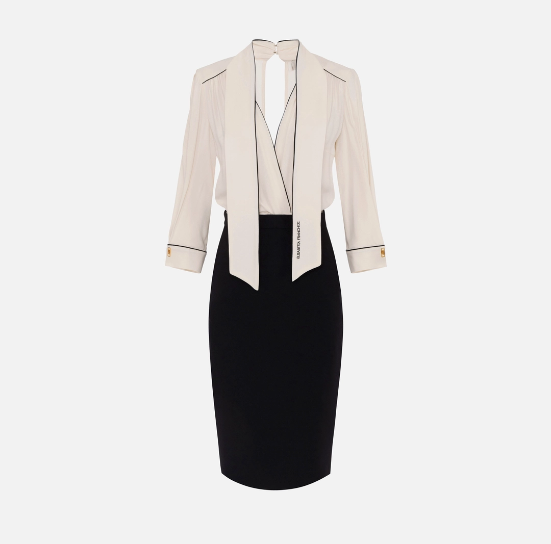 Abito due pezzi con camicia amovibile in georgette di viscosa e gonna in crêpe. La camicia ha scollo a V con sciarpa logata e dettagli di piping a contrasto, la gonna ha linea a tubino con lunghezza sotto al ginocchio. Vestibilità slim.