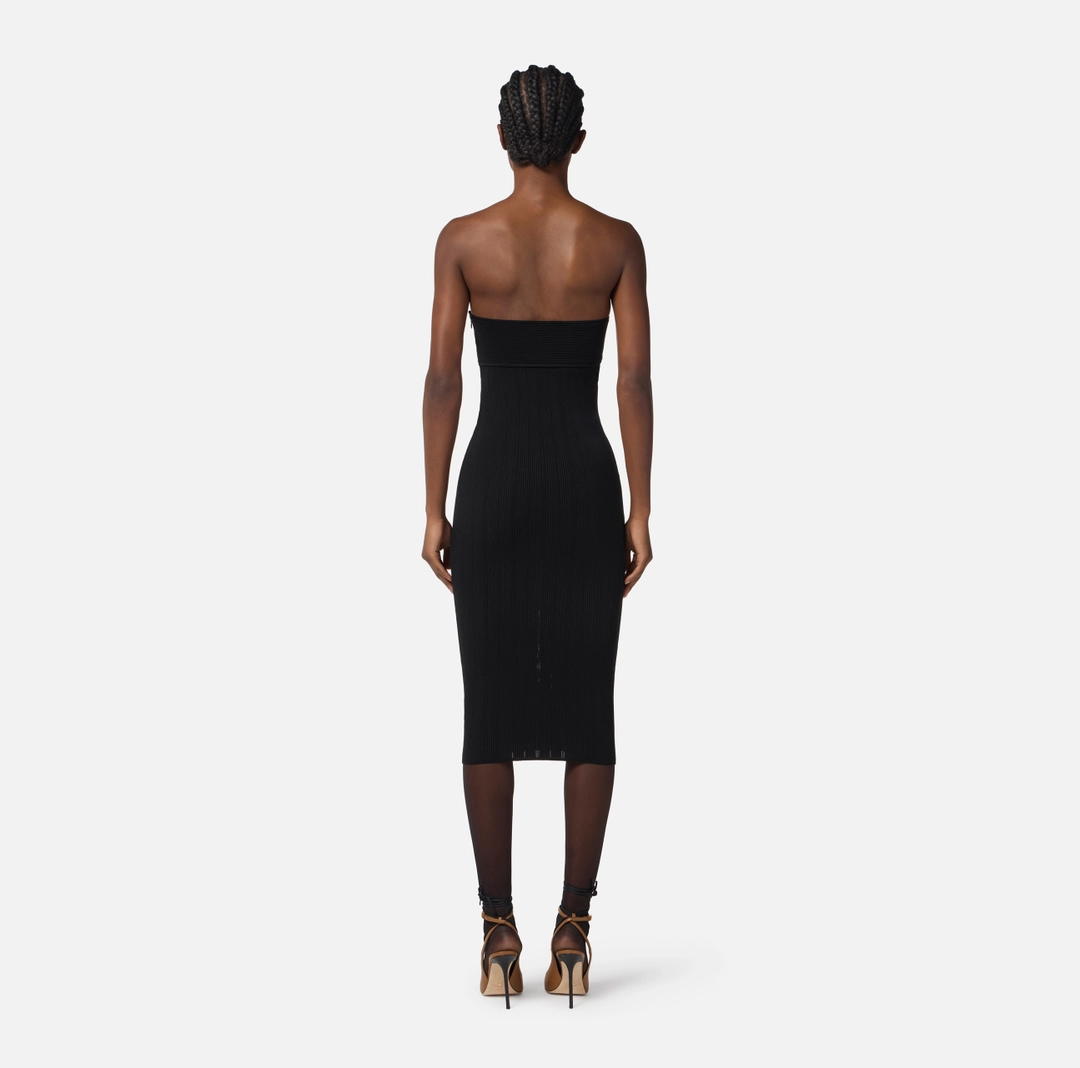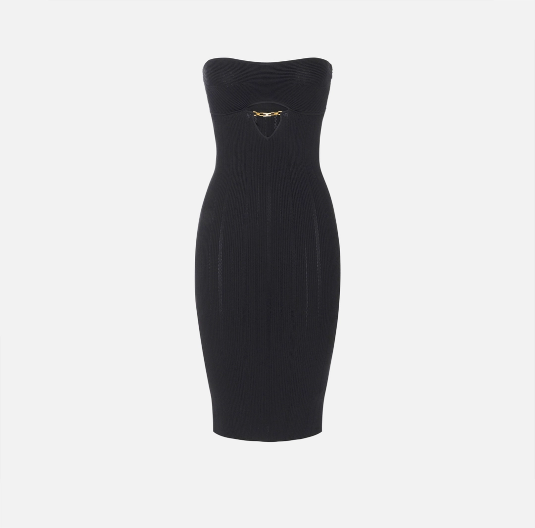 Abito a tubino in maglia dalla vestibilità aderente. Il vestito ha spalle scoperte e si distingue per lo scollo a fascia con cut-out, impreziosito dal dettaglio con logo gioiello. Le lavorazioni a costine e i dettagli à jour donano morbidezza e definizione a tutta la lunghezza del capo.