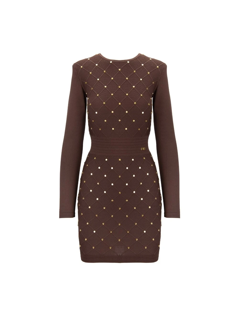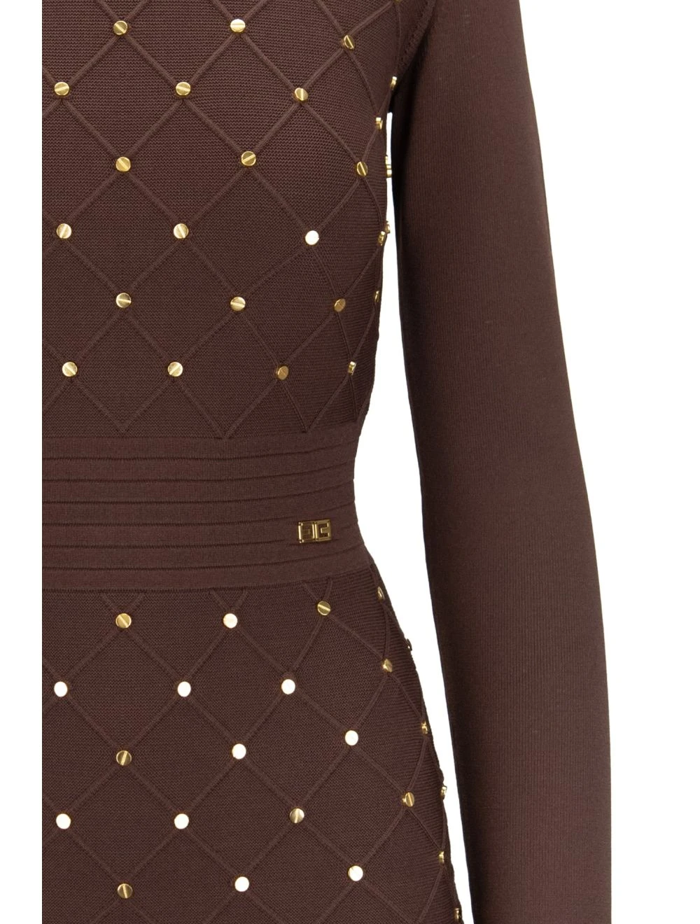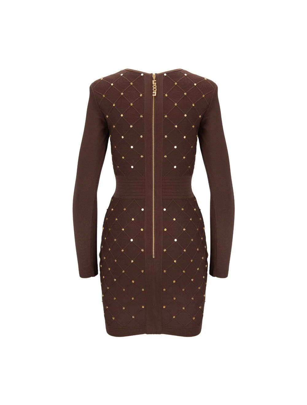 Abito girocollo a maniche lunghe. Spalle imbottite internamente. Superficie esterna caratterizzata dettagli in metallo color oro. Presenta, lateralmente ad altezza vita, hardware logato. Chiusura posteriore tramite gancetto e cerniera, quest’ultima con cursore con ciondolo logato in metallo color oro ed impreziosito da brillanti/pietre.