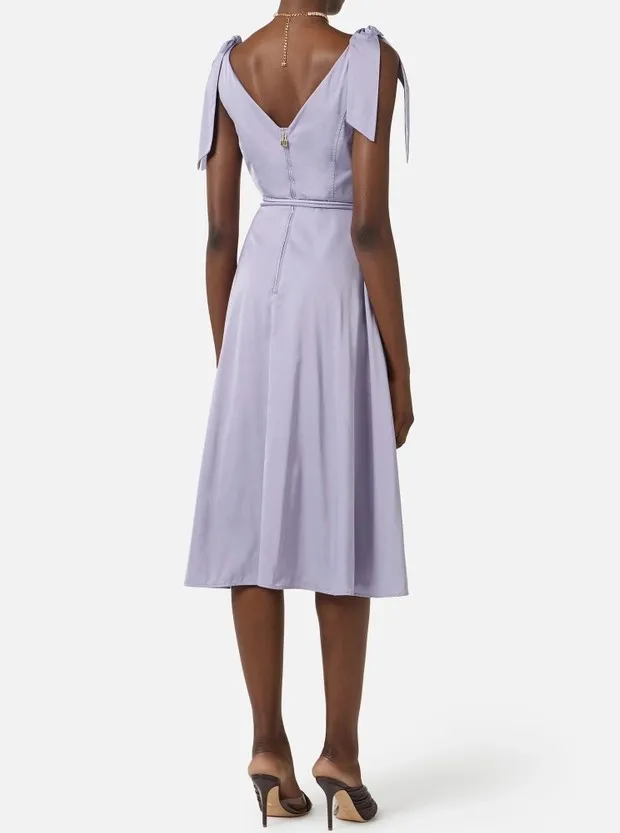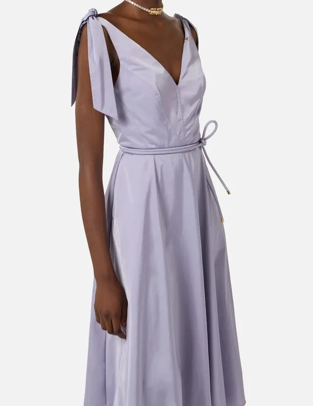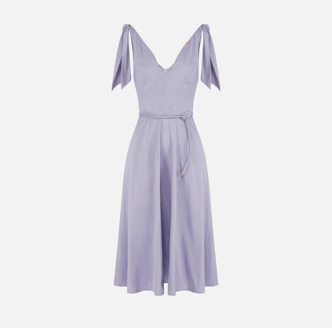 Abito in tessuto vela dalla vestibilità regular. Il vestito ha gonna a ruota con lunghezza midi e si distingue per lo scollo con nodi sulle spalle a creare movimento. La cintura tubolare definisce il punto vita. Un piccolo dettaglio con logo illumina lo scollo.