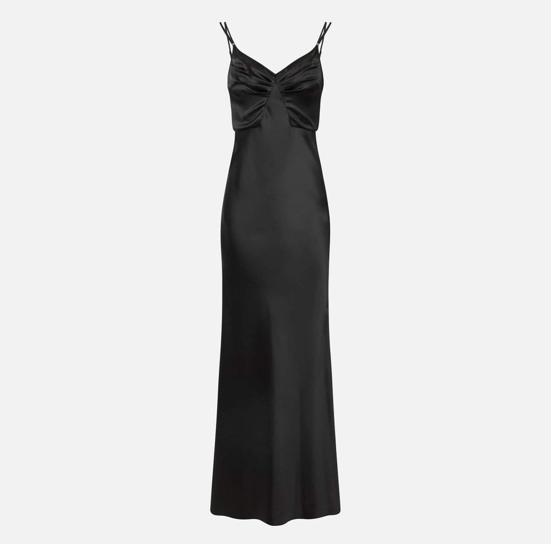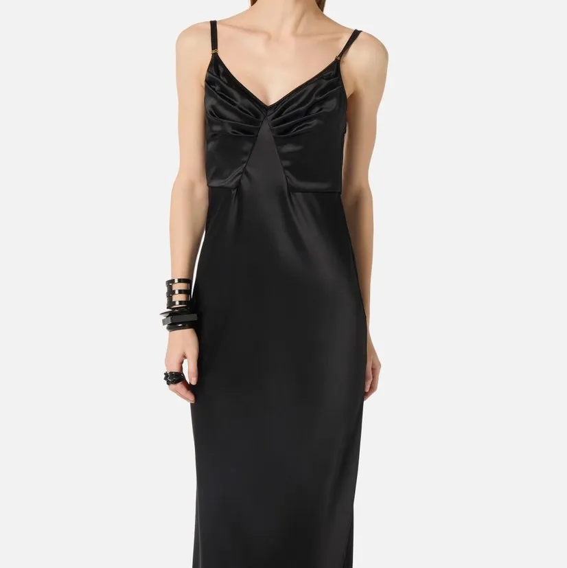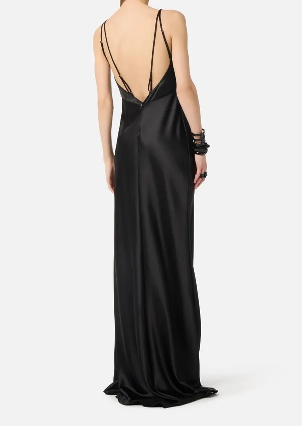 Abito da sera in raso dalla vestibilità slim. Il vestito ha doppie spalline, trattenute dal dettaglio in metallo dorato con logo. Si distingue per le coppe ingentilite da motivi di arricciatura e per la gonna lunga con coda a sirena, per una silhouette d’impatto.
