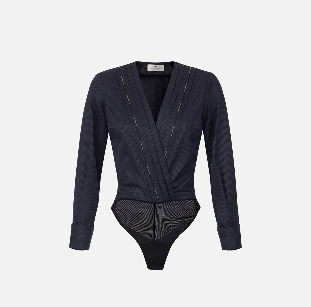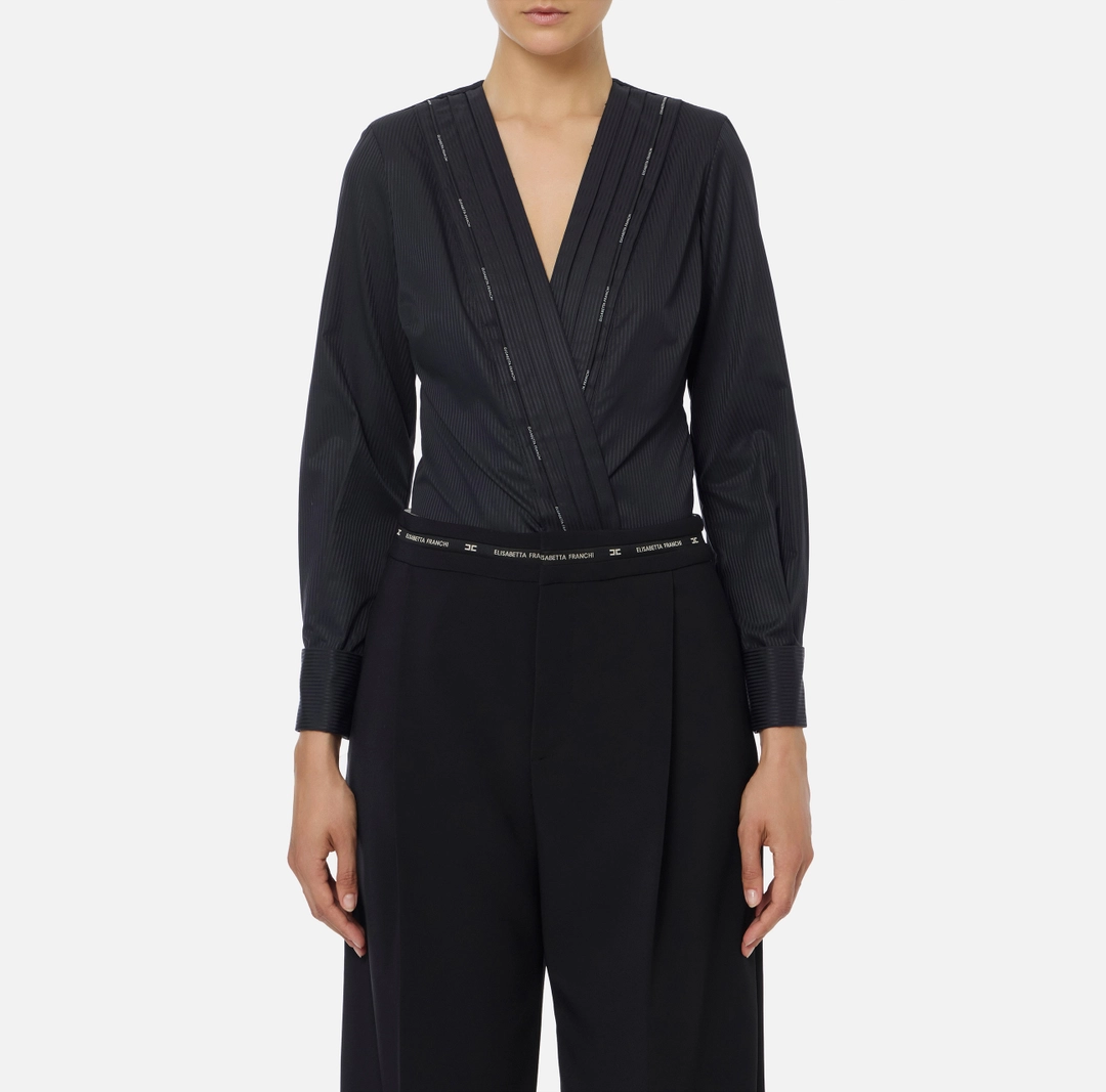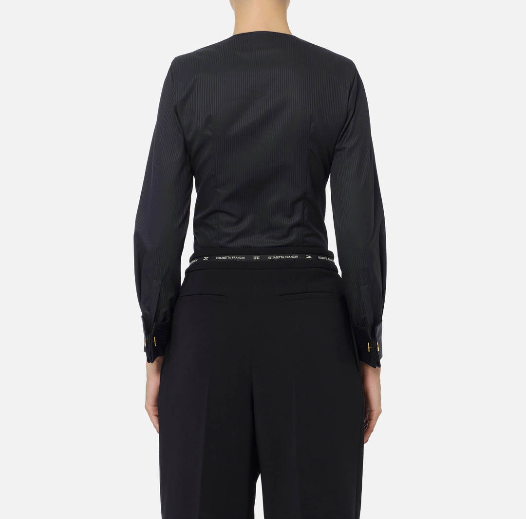 Body in popeline di cotone dalla vestibilità regular. È ingentilito dalla pieghettatura sullo scollo che richiama il plastron dei modelli smoking e dal piping con logo a contrasto. I polsi a righe in tono sono illuminati da gemelli in metallo dorato.