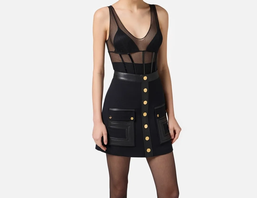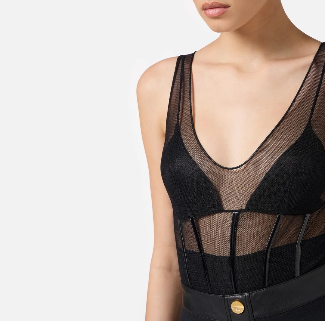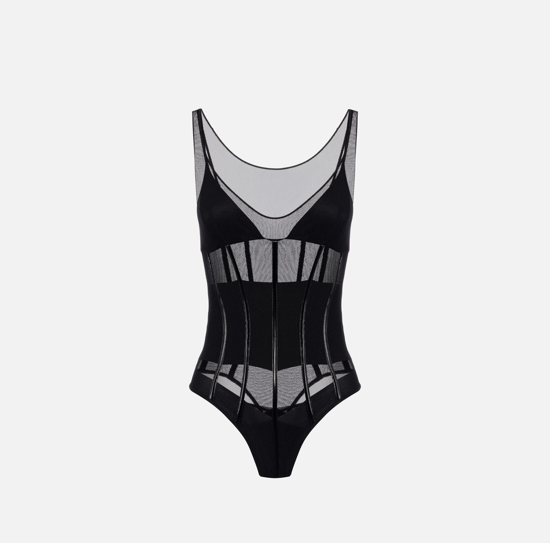 Body in tulle stretch. Ispirato alla lingerie più seducente, si distingue per i giochi di trasparenze con le coppe in raso e la fascia interna in jersey. Definito da dettagli in vinile che scolpiscono la silhouette con una linea a corsetto e creano sensuali contrasti di texture. Vestibilità aderente.