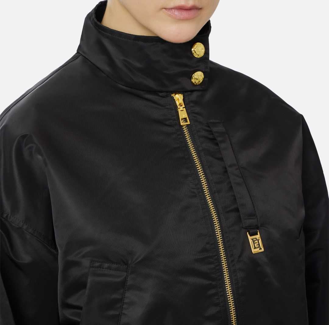 Bomber in nylon dalla vestibilità over. Il giubbotto ha colletto alto in tessuto e maniche ampie. I bottoni in metallo dorato aggiungono note luminose, il taschino è decorato dalla placca con logo. Rifinito con polsi e vita in maglia.