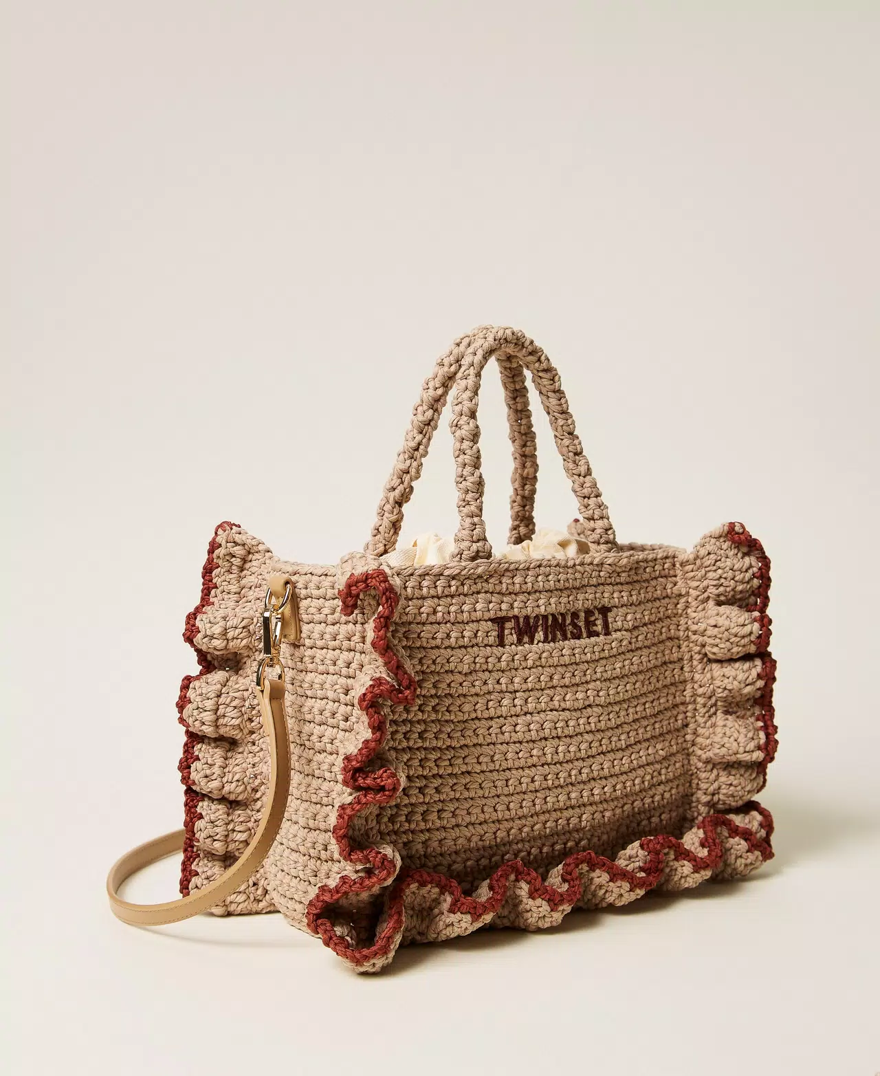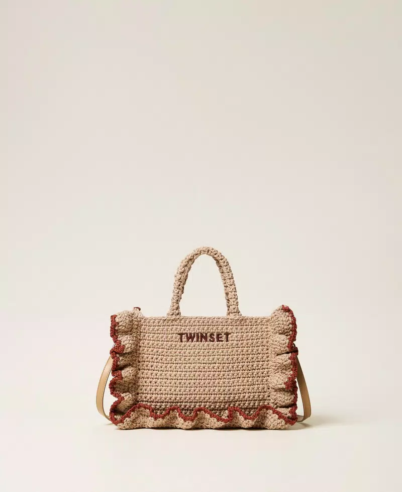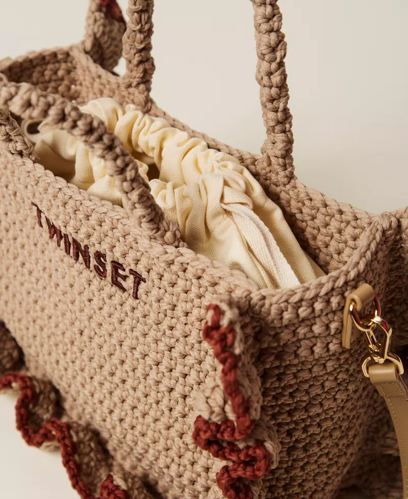 Borsa a tracolla in filo grosso realizzato interamente a mano a crochet, rifinita da balze con profili in colore a contrasto. Ha chiusura con coulisse, doppio manico crochet tubolare a mano, tracolla cross-body rimovibile e regolabile, fodera, logo lettering ricamato.