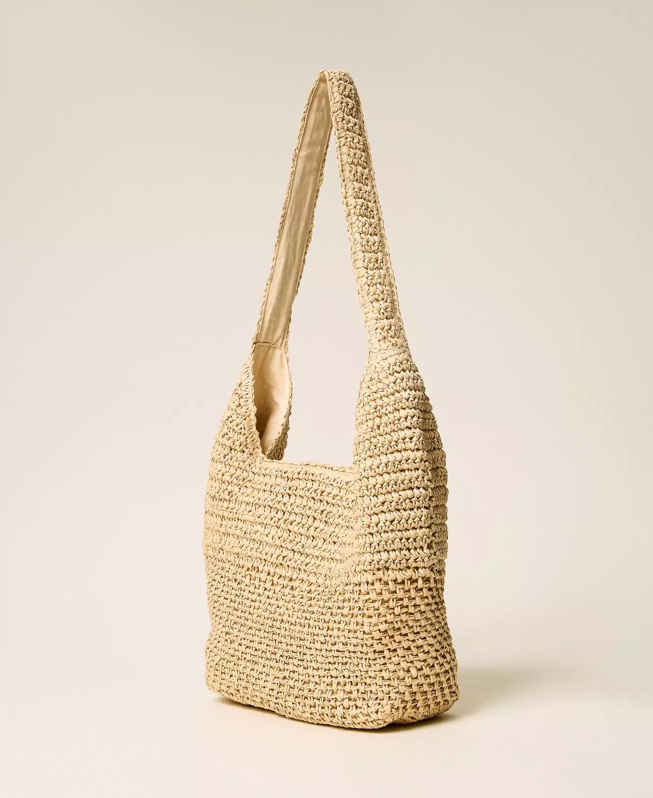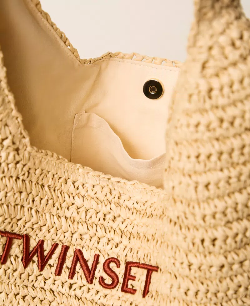 Borsa hobo in rafia lavorata interamente a mano a crochet con logo lettering ricamato a contrasto. Ha tracolla a spalla, chiusura con bottone magnetico, fodera.