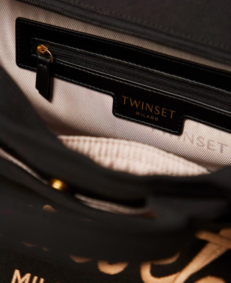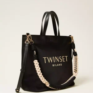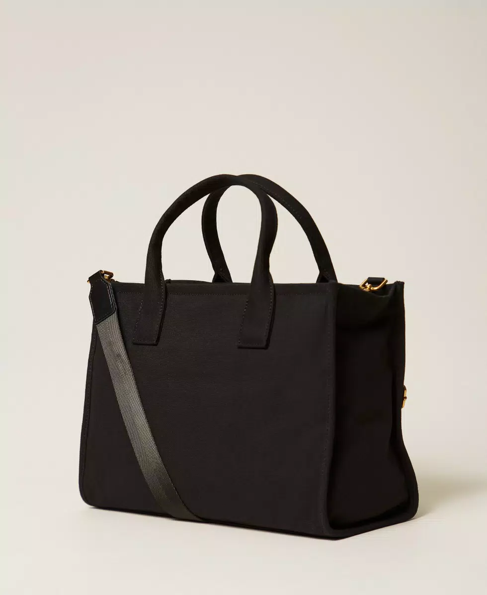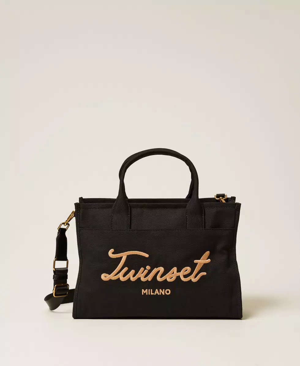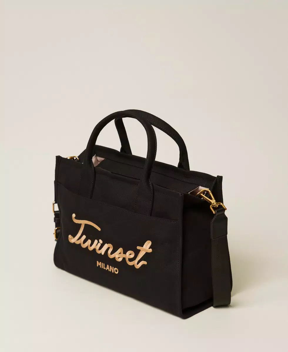 Borsa shopper in canvas con logo ricamato in rilievo con filo opaco in contrasto di colore. Ha chiusura con zip, doppio manico a mano, tracolla cross-body regolabile e rimovibile in nastro, foderata.