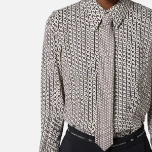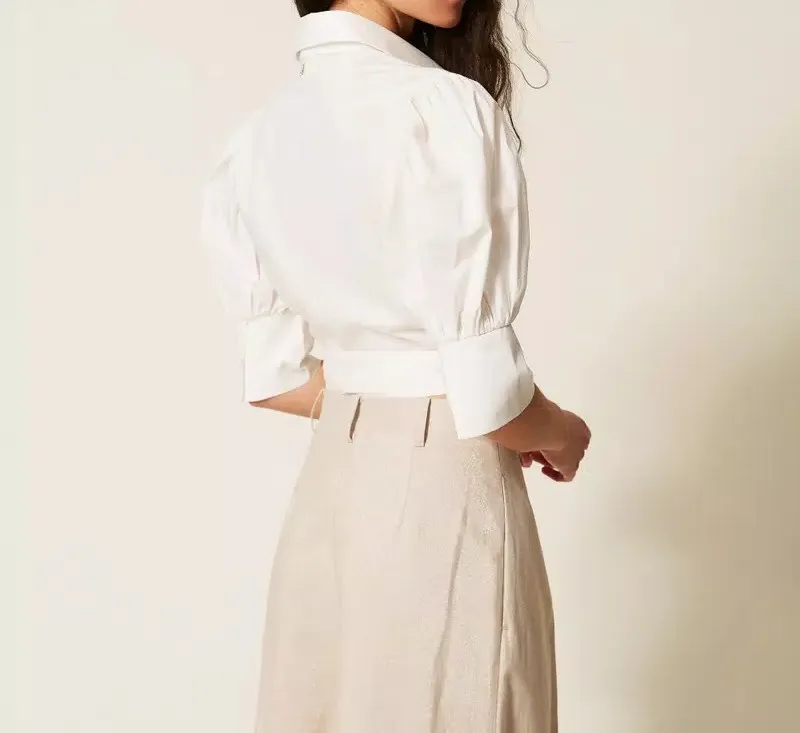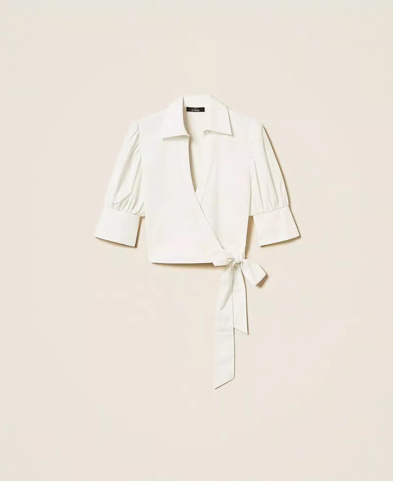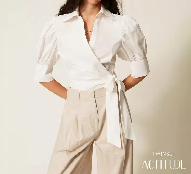 Camicia collezione Actitude in popeline di cotone stretch con chiusura a portafoglio e nastro da annodare al fianco. Ha colletto e scollatura a V, maniche lunghe al gomito con arricciatura ai giri, polsi alti al fondo, linea slim.