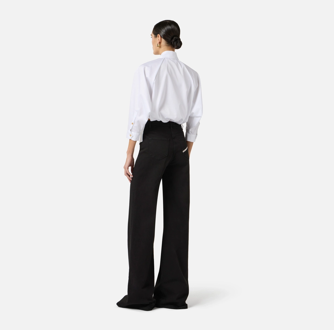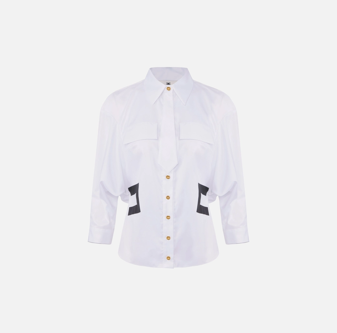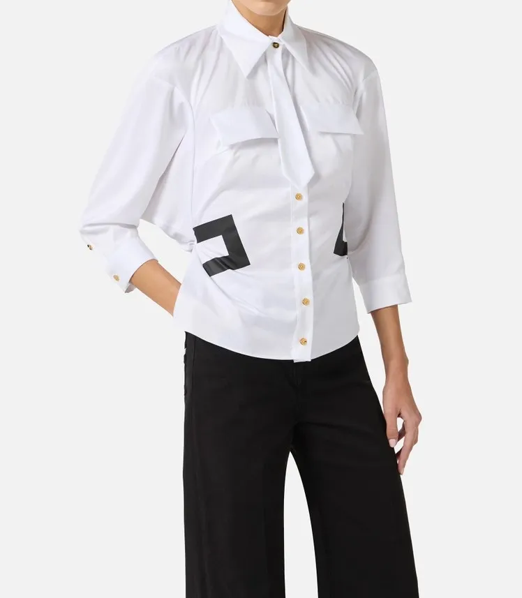 Camicia in cotone dalla vestibilità slim. Ha colletto classico, maniche lunghe dal volume ampio e bordo più lungo sul davanti con arricciatura sul retro. È impreziosita dal cravattino in tessuto coordinato e dalle patte applicate sul busto. La stampa con logo esalta I fianchi con un dettaglio grafico.