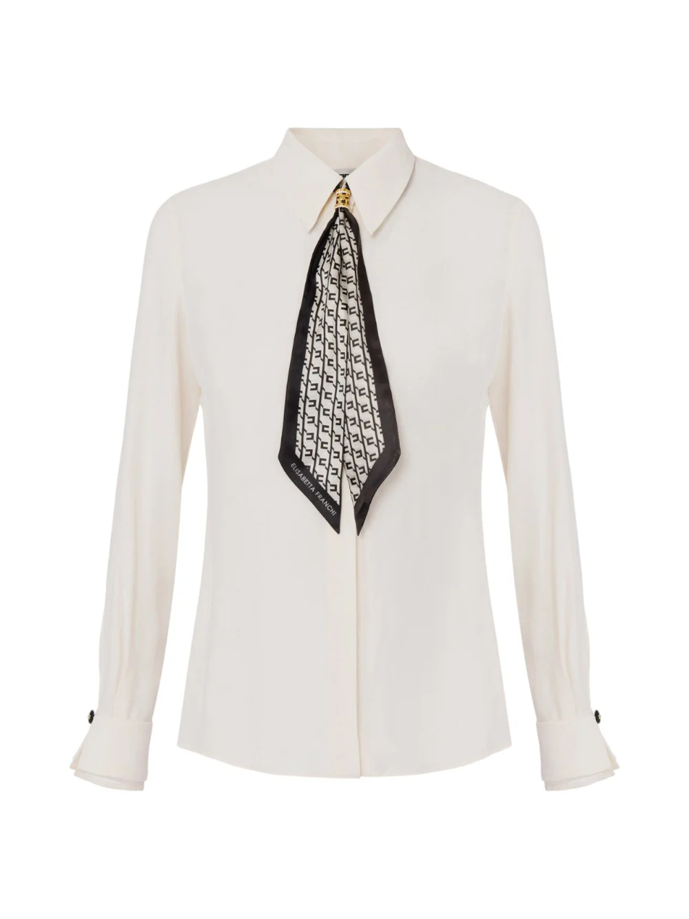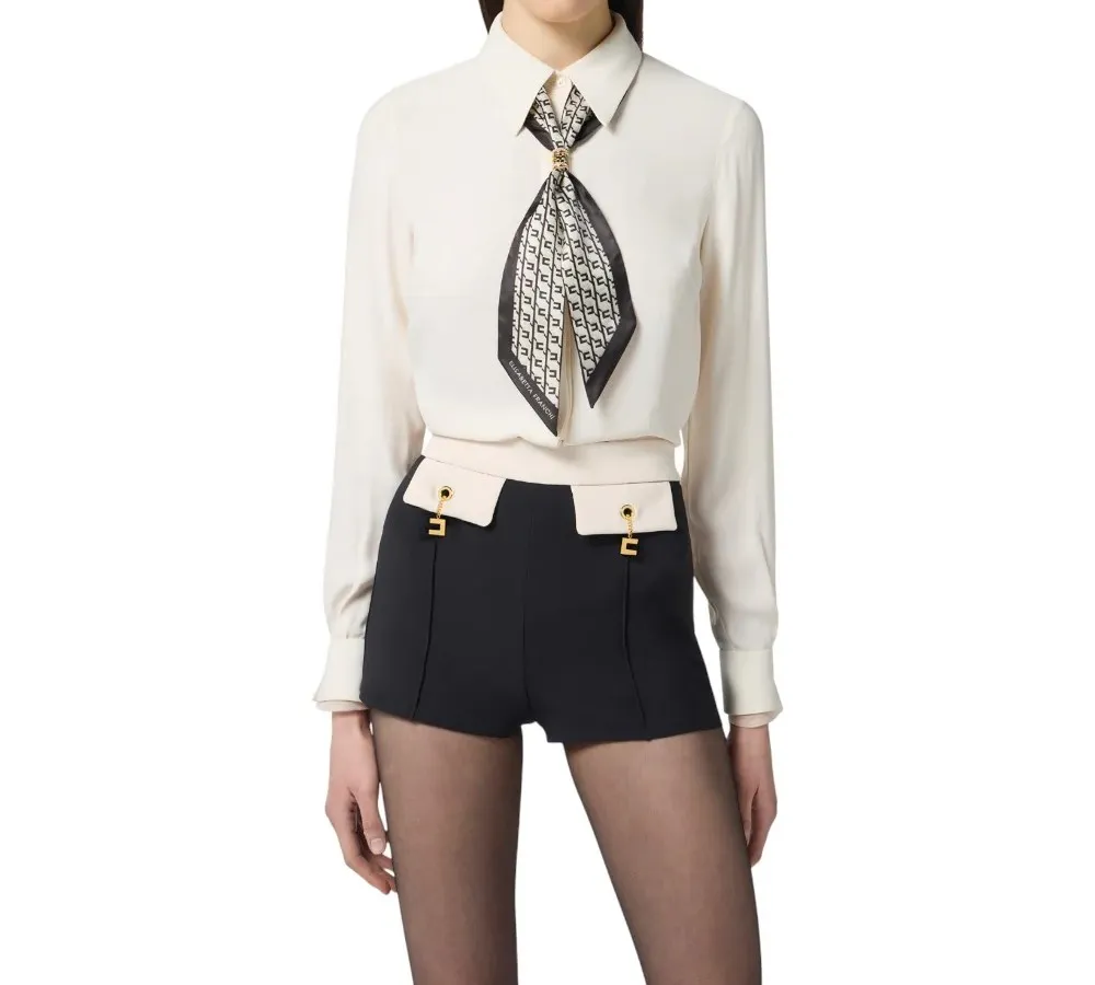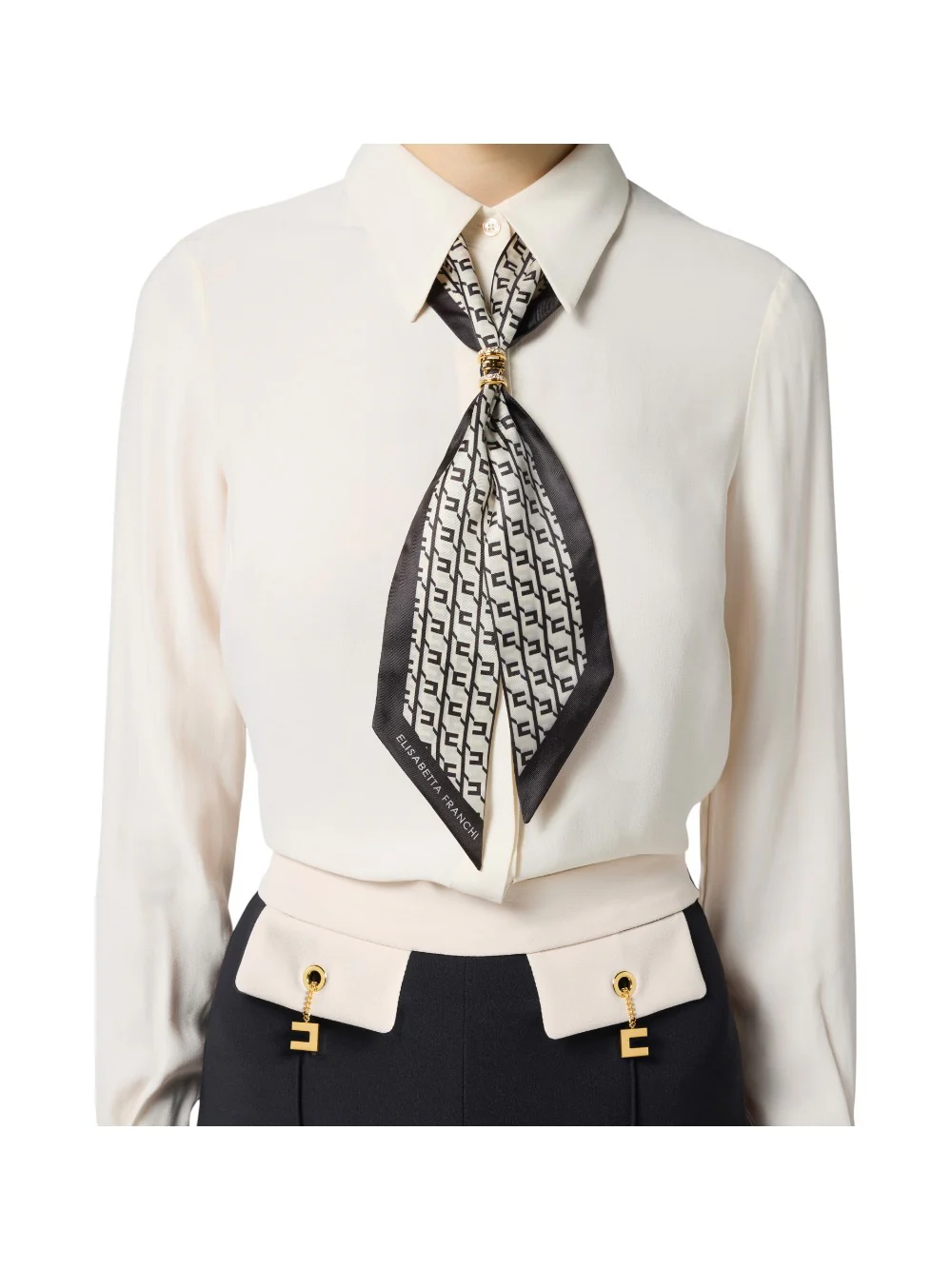 La camicia in georgette con foulard unisce raffinatezza e dettagli sofisticati in un capo dalla vestibilità slim. Realizzata in 100% viscosa, presenta un elegante colletto arricchito dal foulard con stampa geometrica, trattenuto dal passante gioiello con logo, che diventa il punto focale del look.