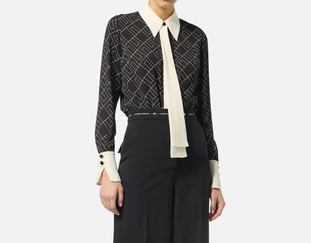 Camicia in georgette dalla vestibilità slim. Presenta colletto con doppio foulard, polsi alti e asimmetrici con bottoni smaltati e si distingue per la stampa con pattern di collezione che crea un dinamico motivo bi-color, esaltato dai bordi a contrasto.