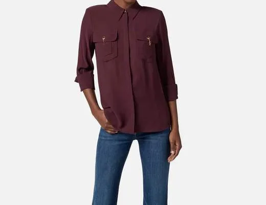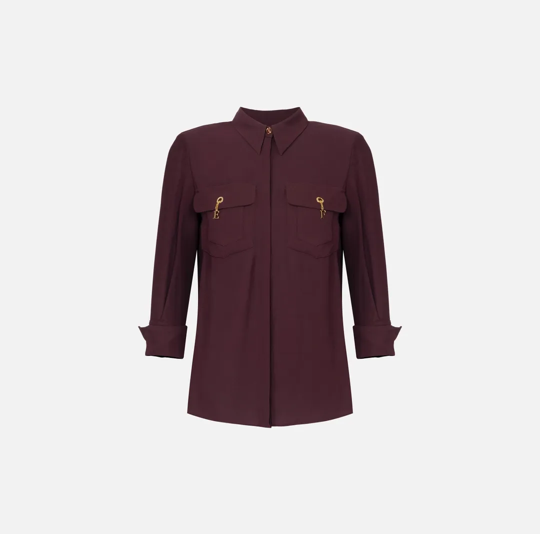 Camicia in georgette di viscosa dalla trama compatta. Il capo ha colletto classico, maniche ¾ e tasche con patta. Focus sui dettagli gioiello: il bottone smaltato a vista, i gemelli pendenti con catena e quelli sui polsi illuminano il capo con molteplici note preziose. Vestibilità slim.