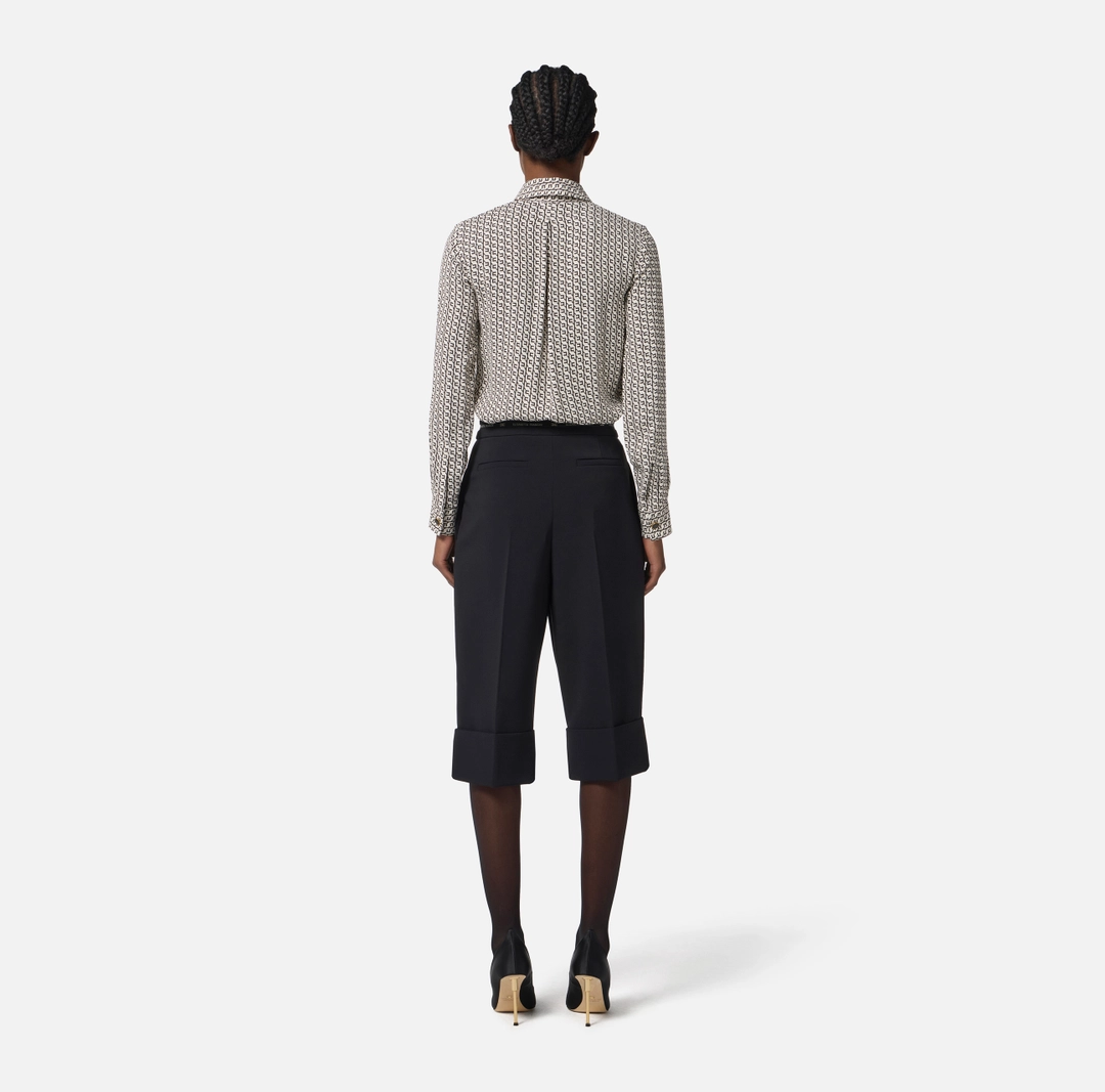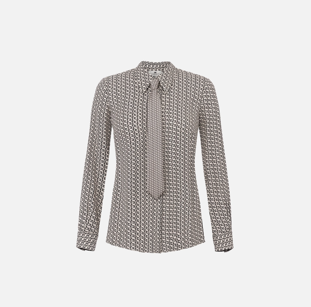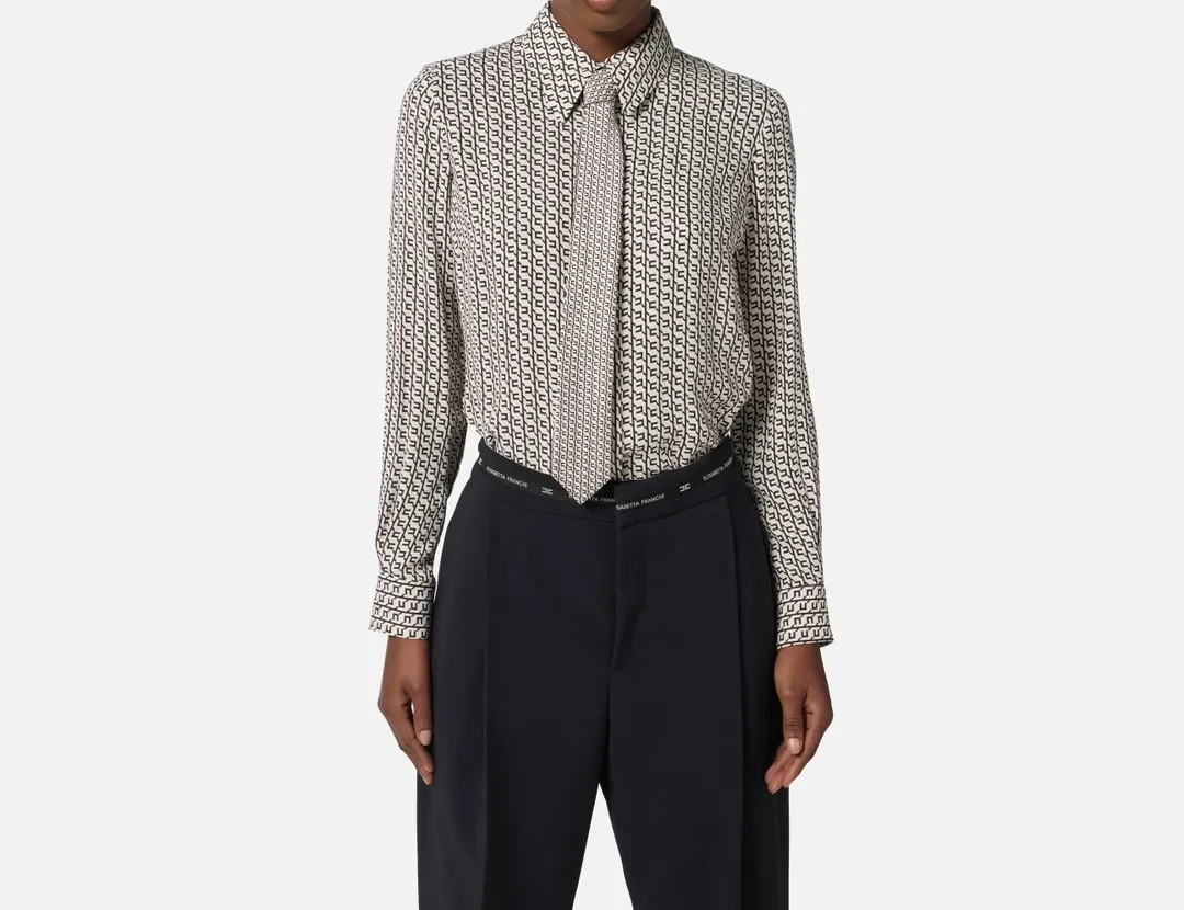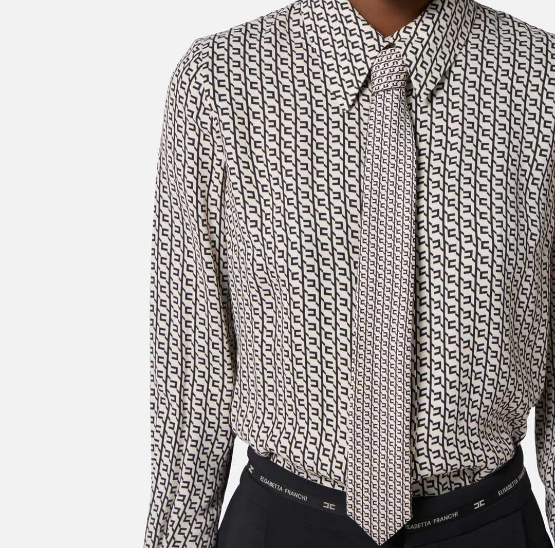 Camicia in georgette di ispirazione maschile con vestibilità slim. Con colletto classico e maniche lunghe, ha texture fluida. Si distingue per il pattern con stampa geometrica, replicato in versione micro sulla cravatta in raso. I bottoni smaltati sui polsi aggiungono un ultimo dettaglio di stile.