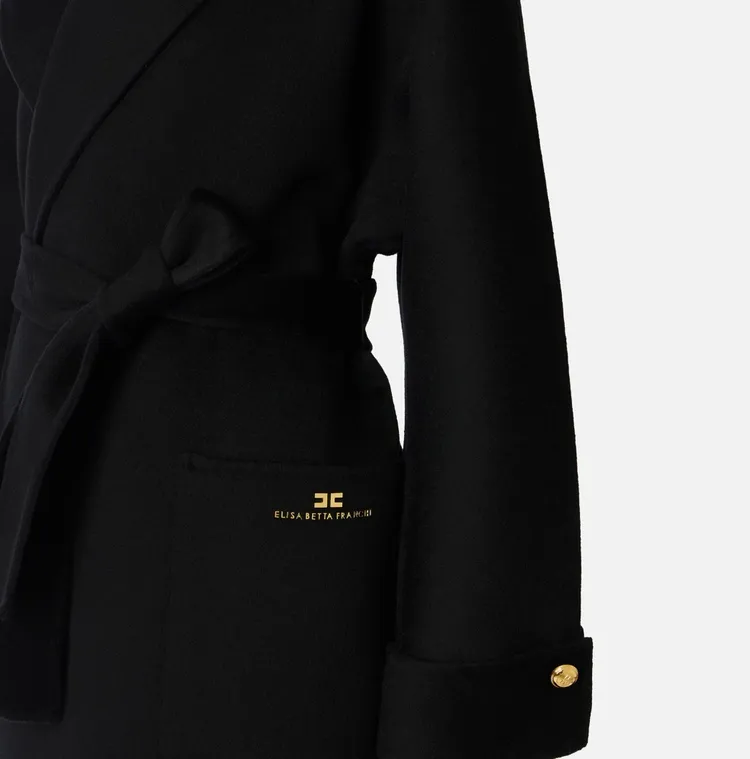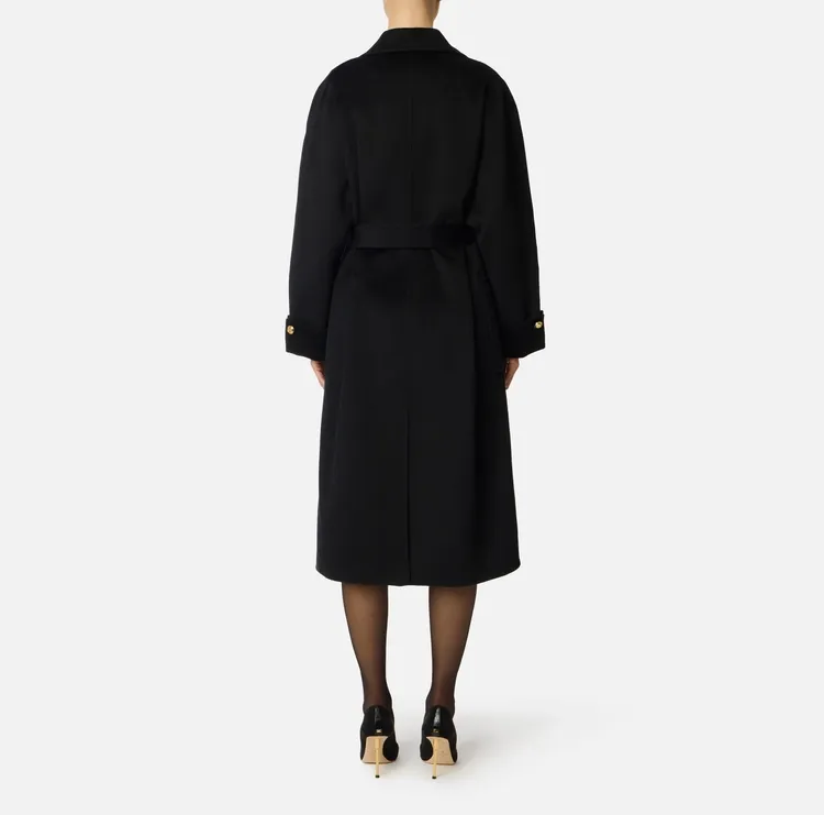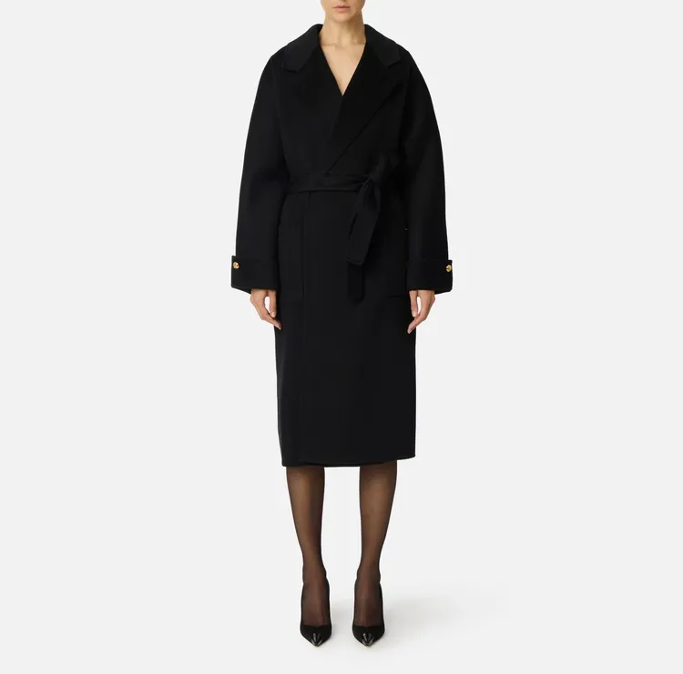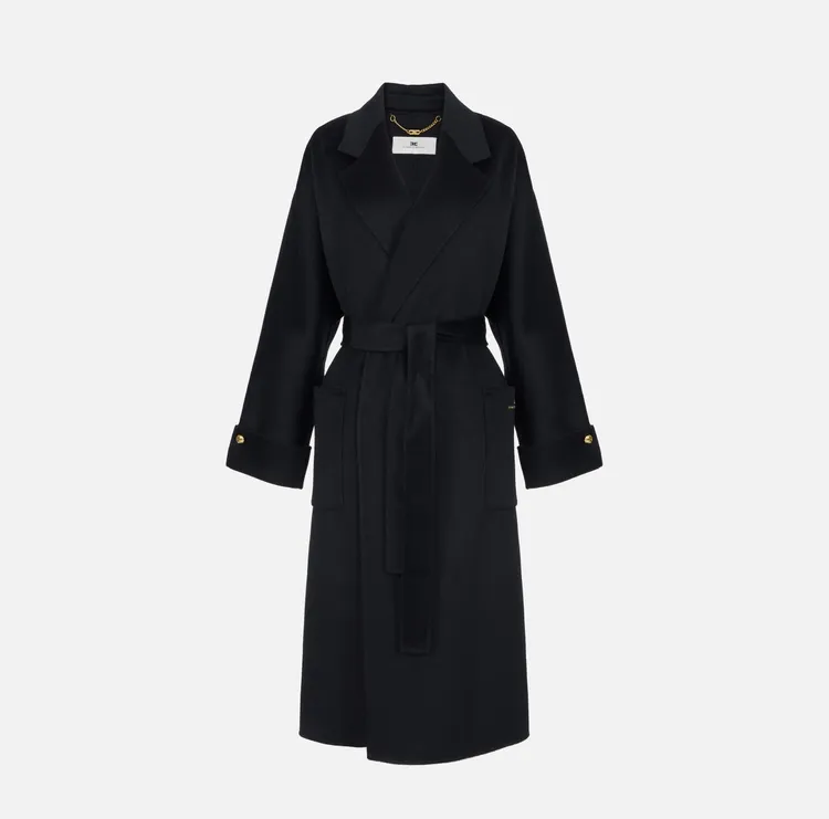 Cappotto a vestaglia in panno di misto lana double, sfoderato e dalla vestibilità over. Con rever, maniche con risvolto e tasche applicate, ha chiusura con cintura per definire il punto vita con morbidezza. L’etichetta con logo e i bottoni in metallo dorato sui polsi aggiungono note di luce.