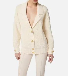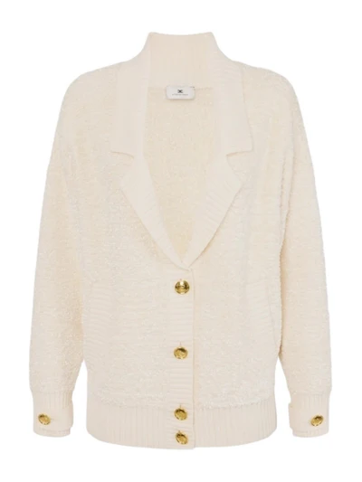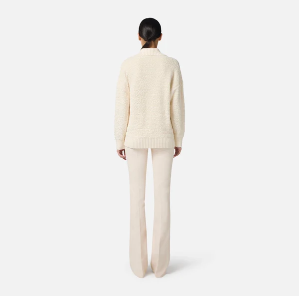 Cardigan in ciniglia bouclé dalla vestibilità over. Il capo ha collo con rever e maniche lunghe con alamari. Rifinito a coste, si distingue per la texture morbida e avvolgente. I bottoni in metallo dorato con logo illuminano il capo e donano un ultimo tocco raffinato.