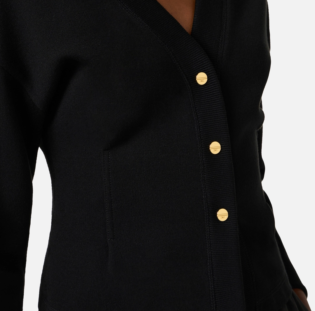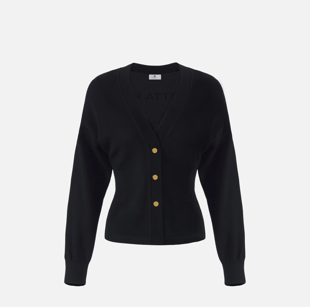 Cardigan in maglia. Ha maniche ampie che regalano volumi avvolgenti e scollo a V. Rifinito con dettagli tubolari e logo sul retro a donare ritmo. I bottoni in metallo dorato aggiungono note luminose. Vestibilità aderente.