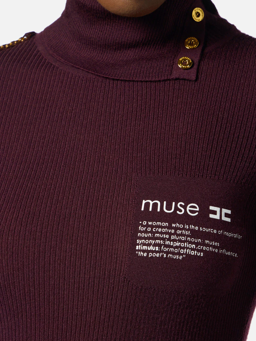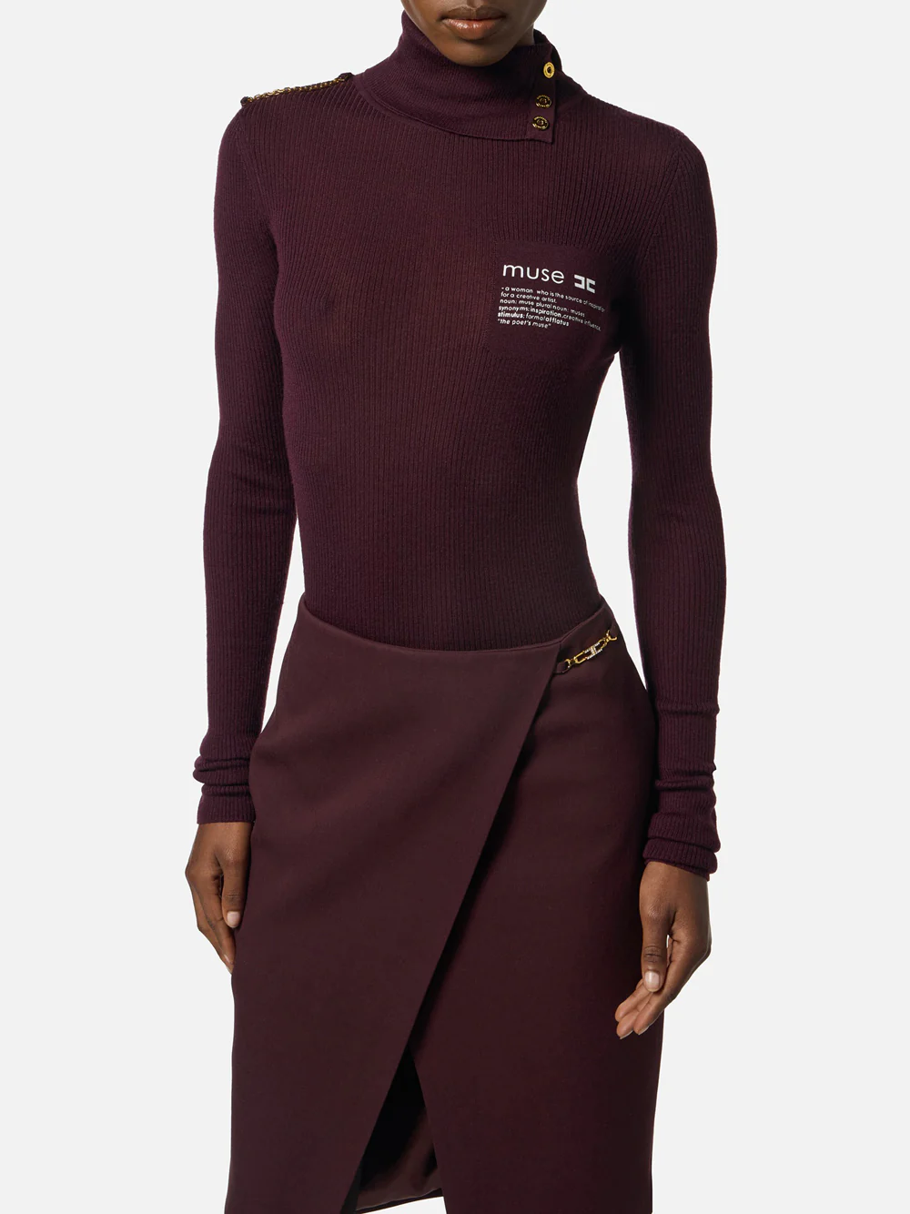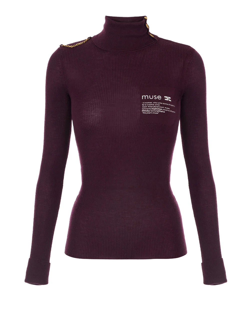 Dolcevita in maglia dalla vestibilità aderente. Ideale come sottogiacca, ha collo dolcevita con apertura laterale e bottoni in metallo dorato, maniche lunghe con risvolto al fondo. Impreziosita dalla stampa con lettering ispirazionale sul davanti e dal luminoso dettaglio in catena su una spalla.