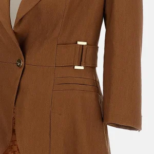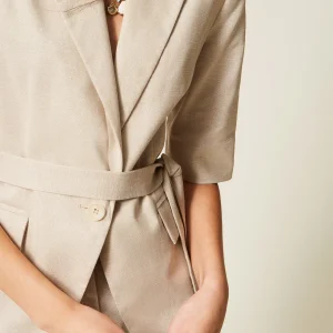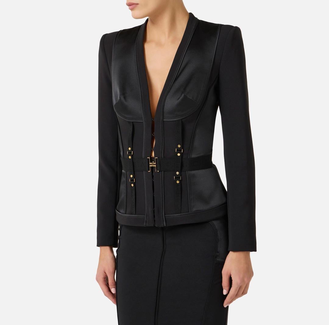 Giacca in crêpe leggero. Il blazer ha spalle strutturate, scollo a V e maniche ¾. Si distingue per la costruzione a bustier definita dagli inserti in raso, a creare sensuali giochi di tagli geometrici. La cintura in vita è arricchita dal logo in metallo dorato. Vestibilità aderente.