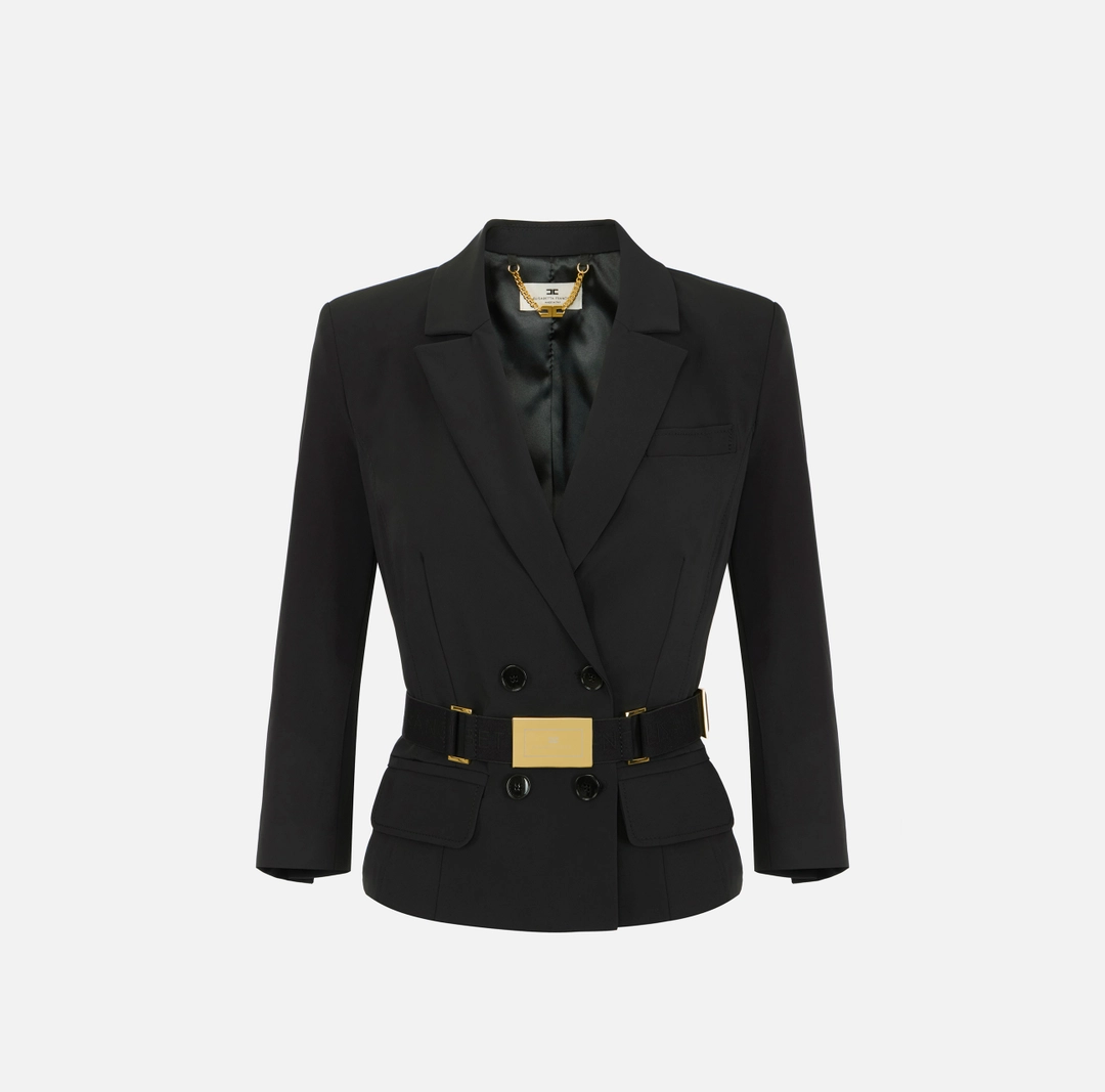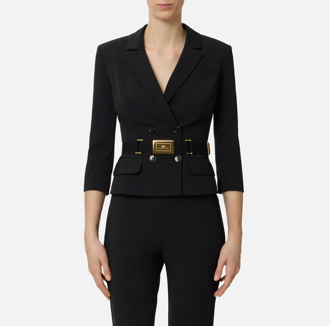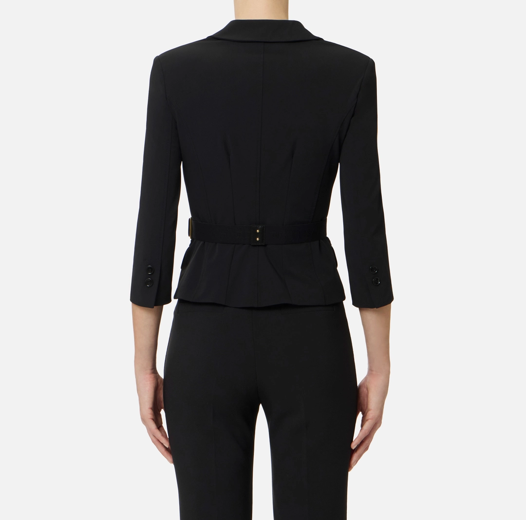 Giacca in tessuto tecnico bielastico. Il blazer ha rever classico, maniche ¾, patte applicate. Il punto vita è sottolineato dalla cintura con placca in metallo dorato, su cui compare il logo ottenuto con lavorazione a laser. Rifinita con impunture. Vestibilità aderente.