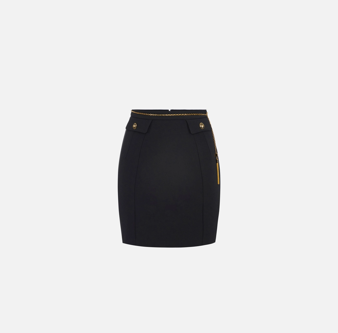 Gonna in doppio crêpe dalla vestibilità aderente. Si distingue per i dettagli preziosi come la cintura in catena con nappina realizzata in metallo dorato. Le patte sono decorate da bottoni smaltati con logo e pattern di ispirazione snake.