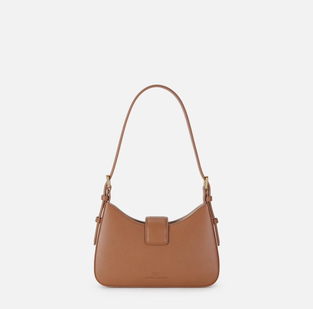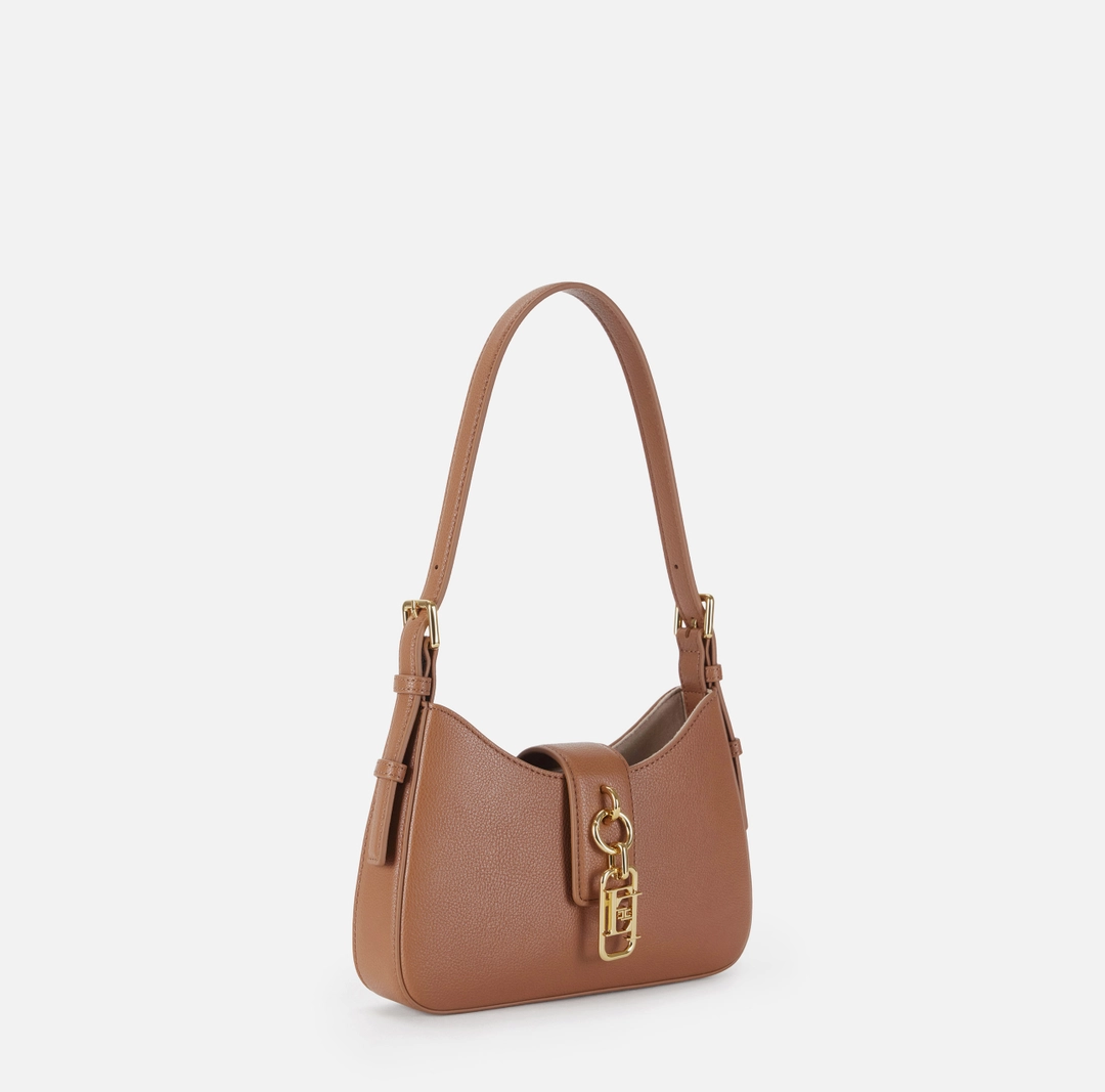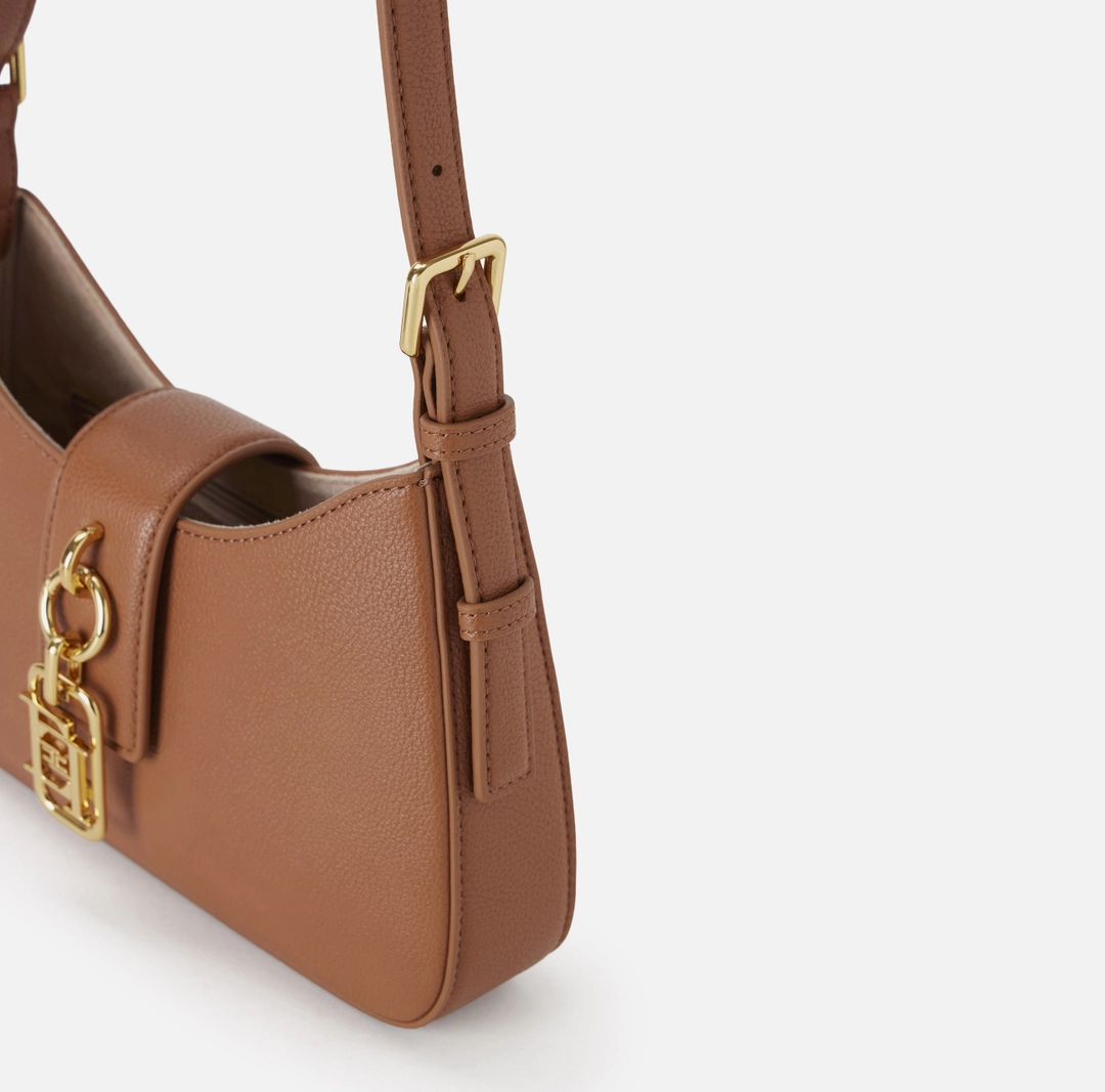 Borsa hobo piccola realizzata in materiale sintetico con texture effetto pelle. L’accessorio ha manico con fibbie e chiusura con linguetta, impreziosita dal dettaglio di charm con logo.