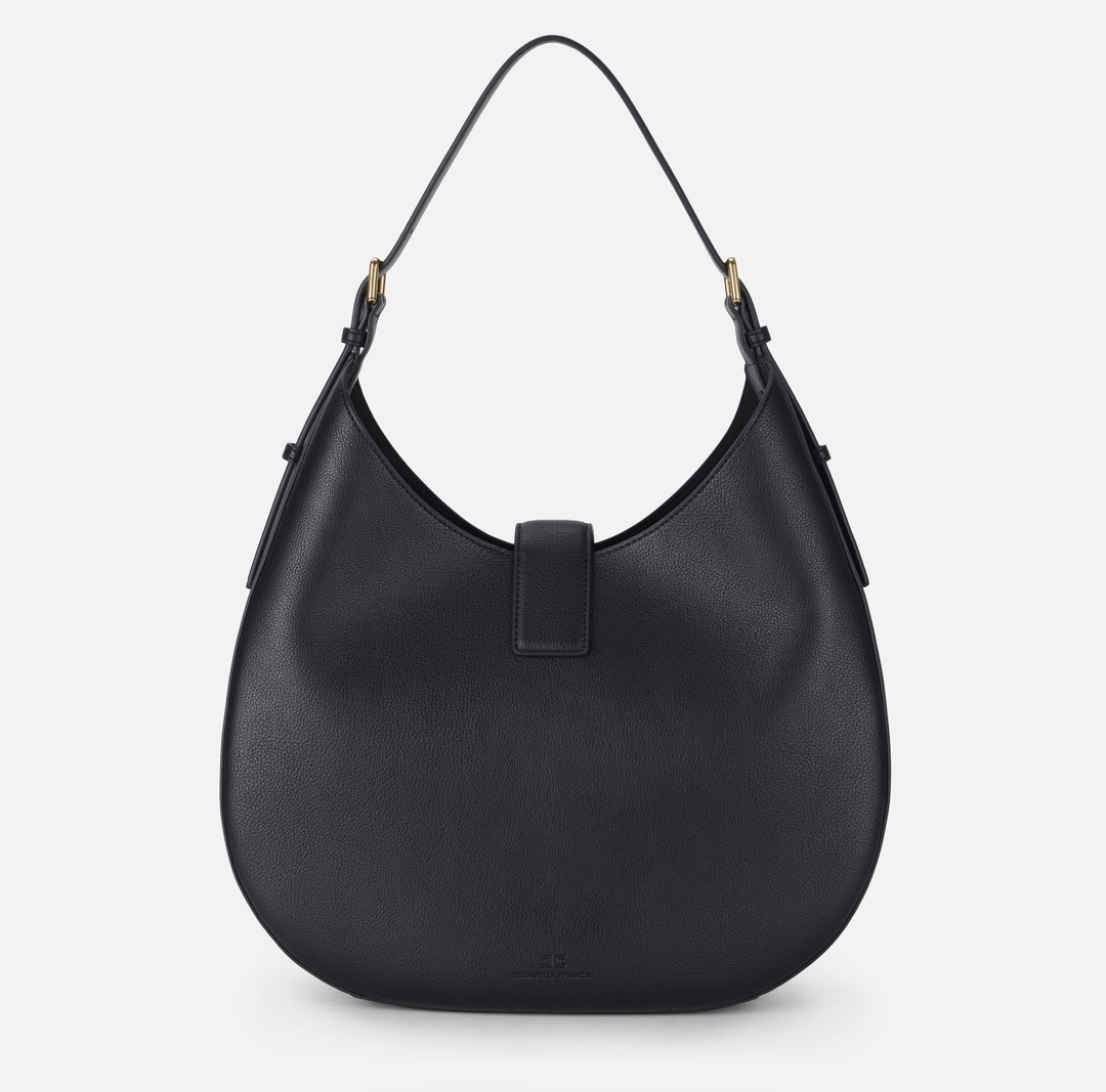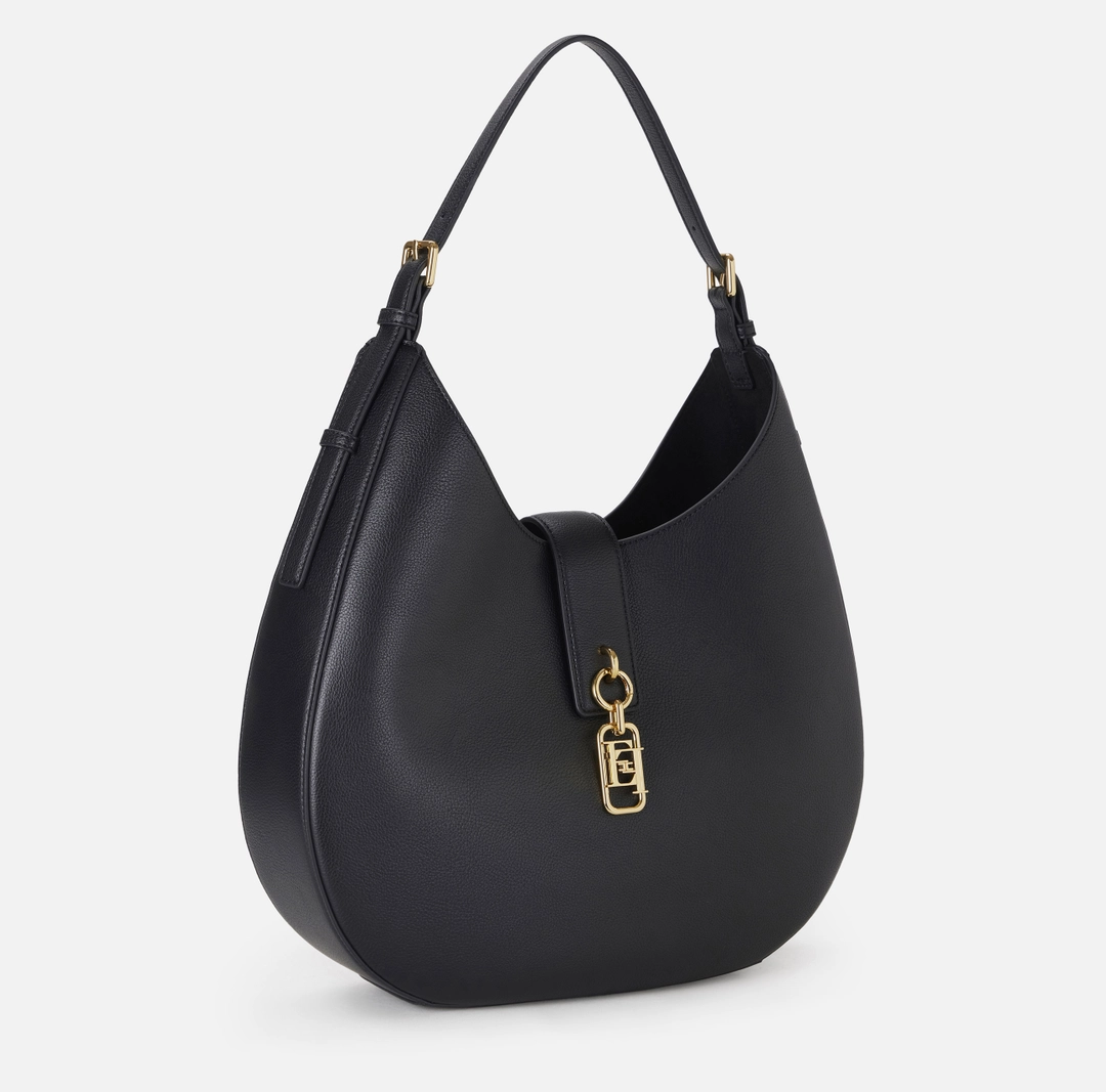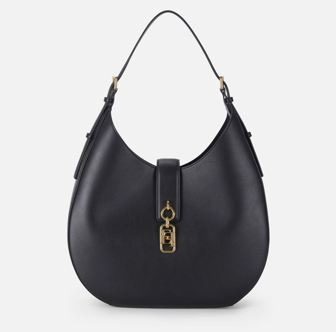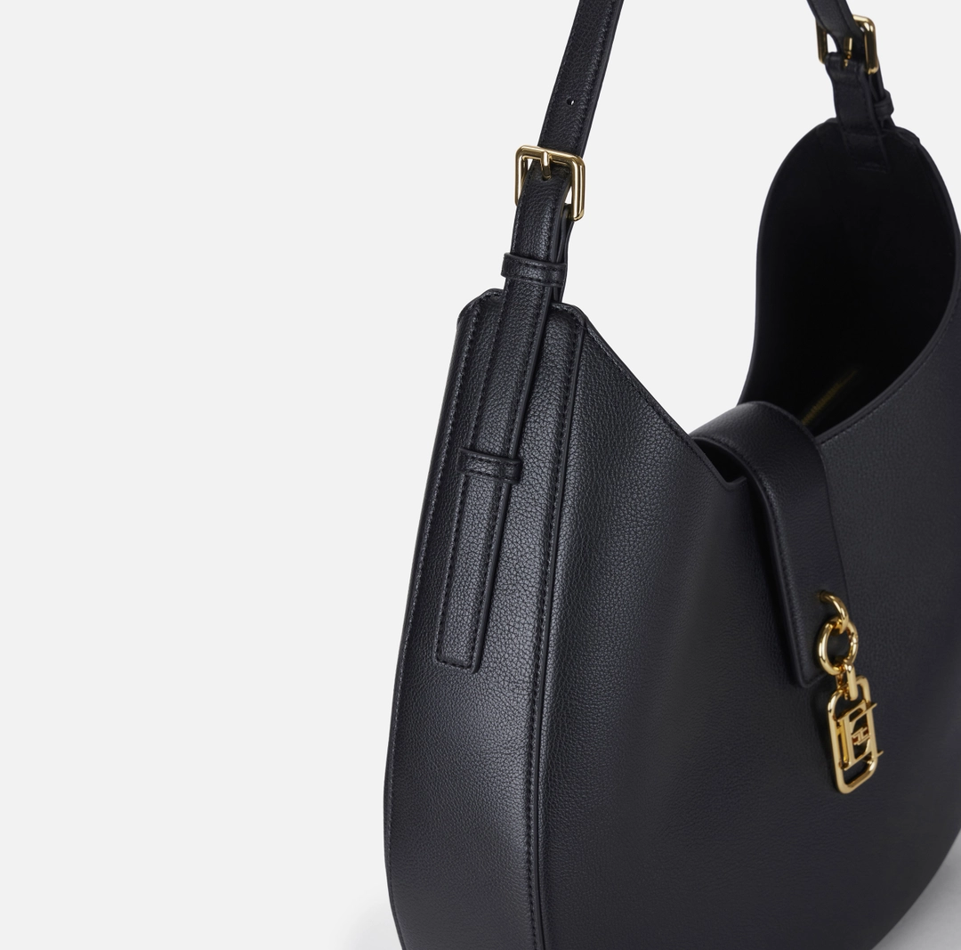 Borsa hobo tonda realizzata in materiale sintetico con texture effetto pelle. L’accessorio ha manico con fibbie e chiusura con linguetta, impreziosita dal dettaglio di charm con logo.