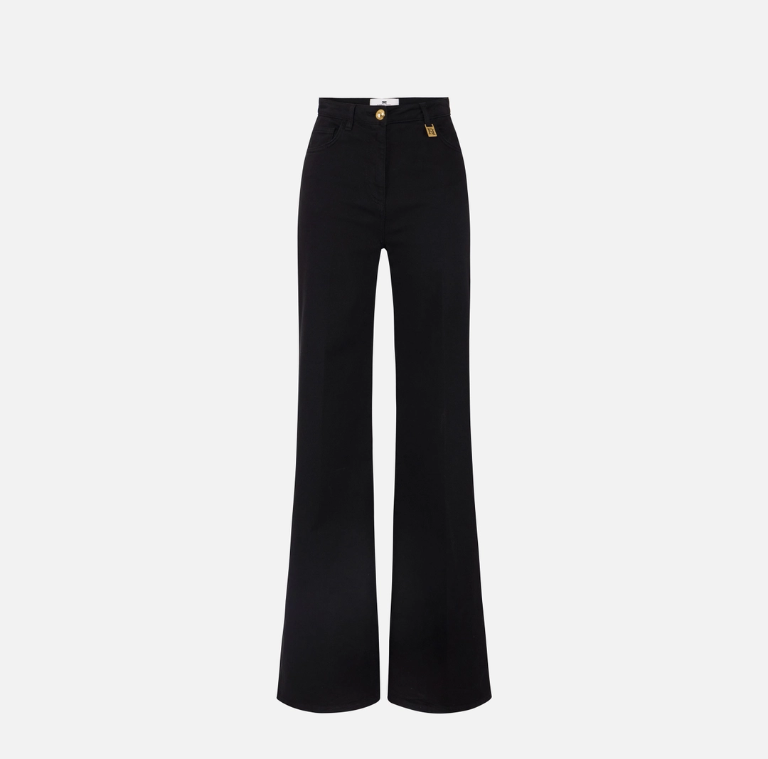 Pantaloni in denim costruiti con vita regolare e gamba a palazzo. Focus sui dettagli: la placca con logo impreziosisce un passante, il bottone in metallo dorato illumina il fascione. Sul retro, tasche applicate di cui una personalizzata dal nastro diagonale con logo. Vestibilità over.