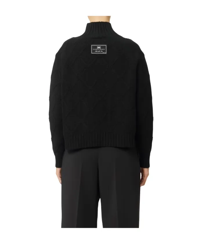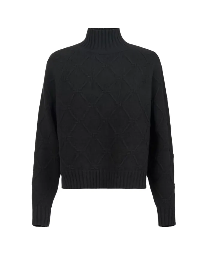 Pullover boxy in maglia dalla vestibilità over. Il capo ha collo alto, maniche lunghe e bordi rifiniti a coste. Si distingue per il pattern con losanghe in trama jacquard, a donare tridimensionalità e compattezza alla texture. L’etichetta con logo sul retro del collo completa il capo.
