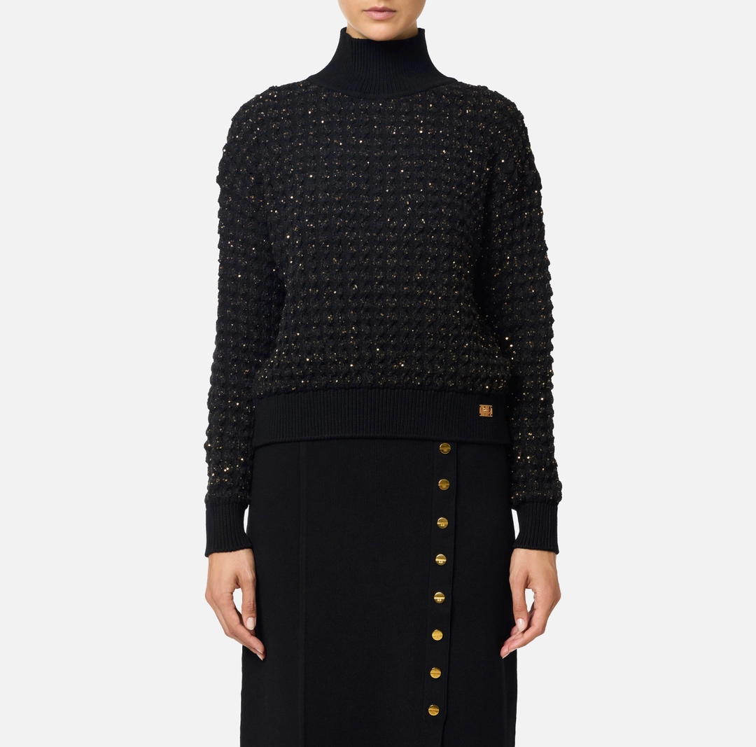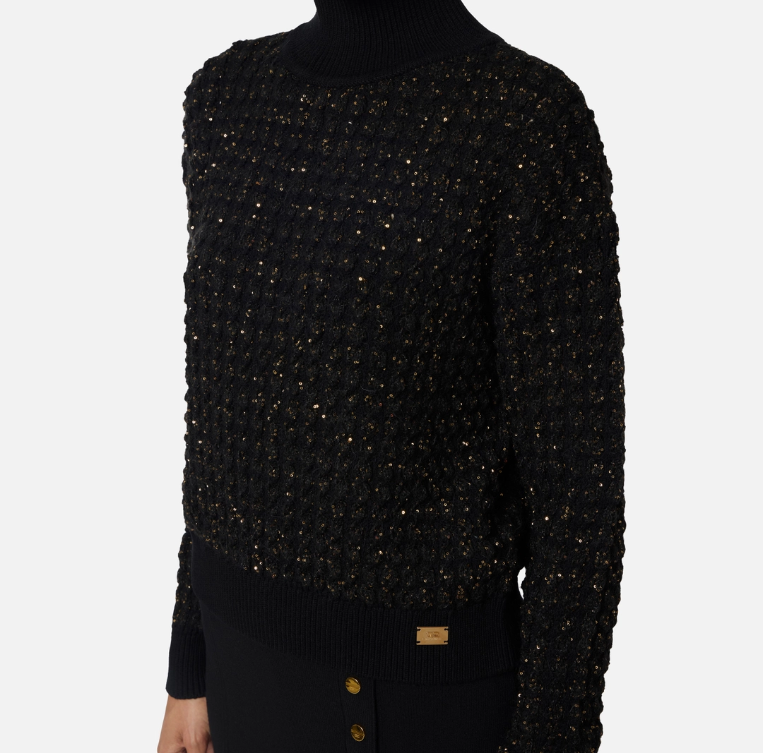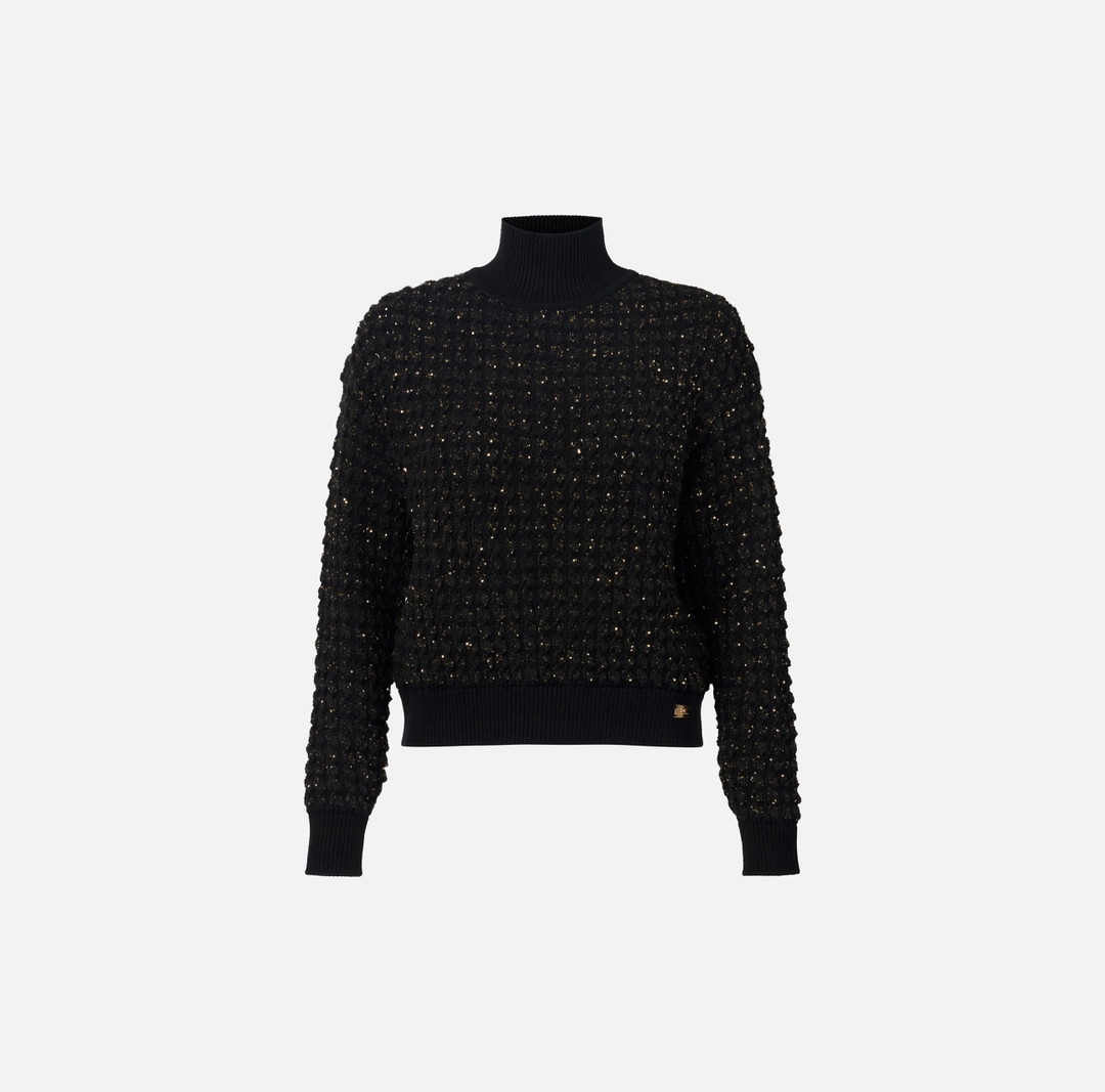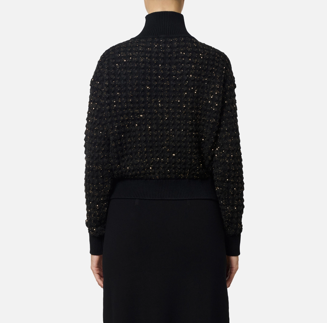 Maglia in bouclé dalla vestibilità regular. Resa preziosa dalle micro-paillettes in trama, ha collo alto e spalle scese. Rifinita con bordi a costine, presenta una placca in metallo con logo al fondo.