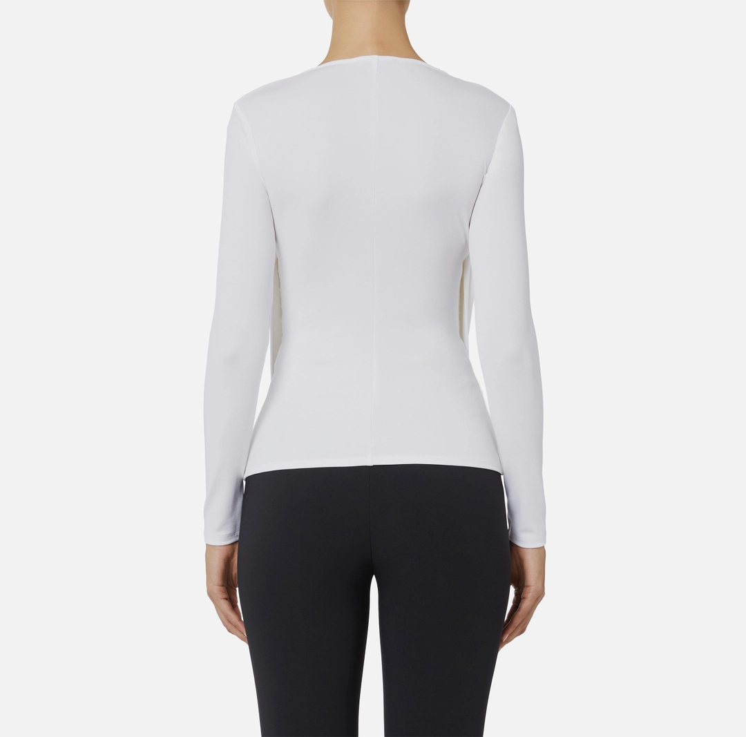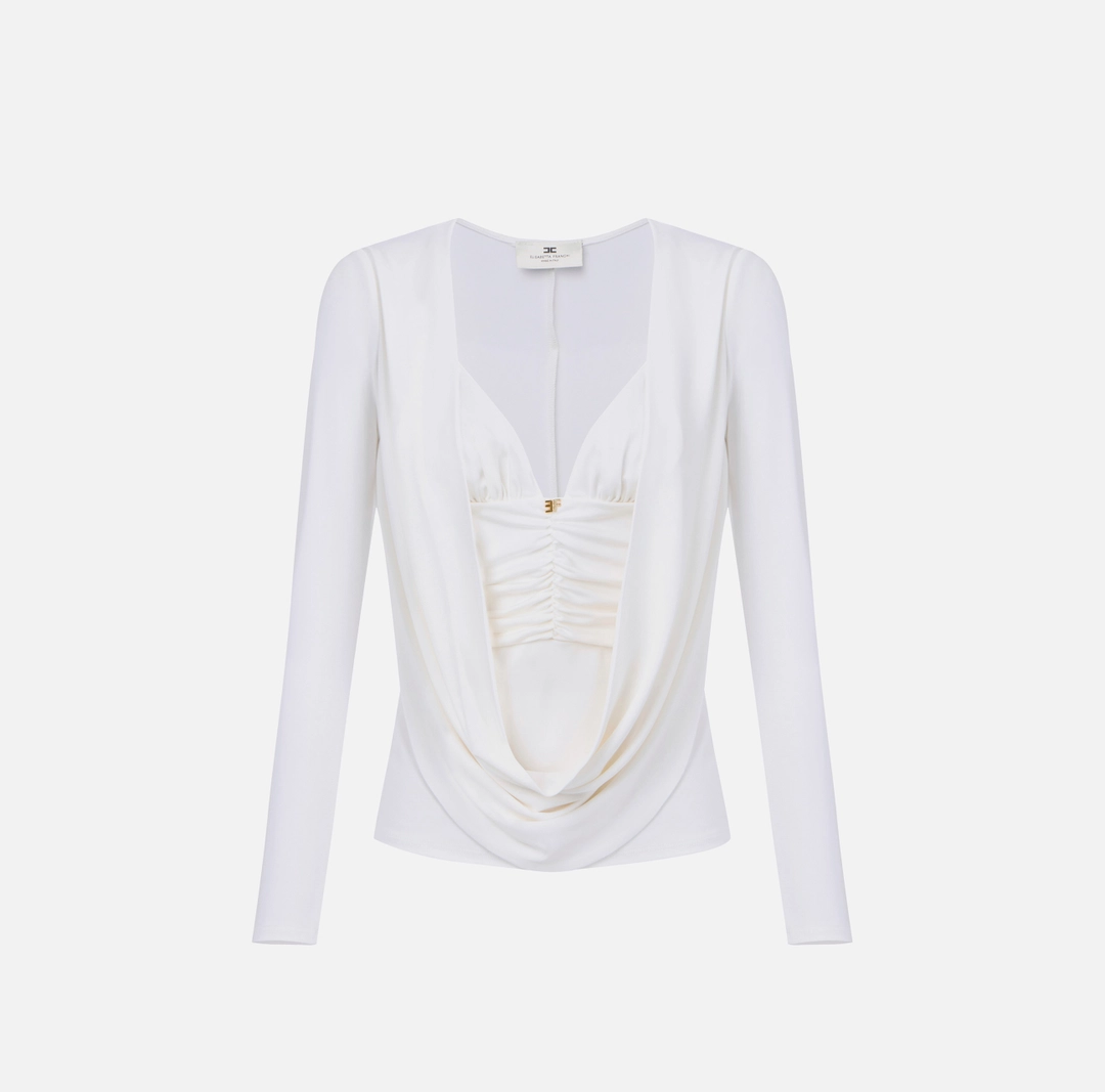 Maglia in jersey crêpe con maniche lunghe. Si distingue per lo scollo ampio e morbido che lascia intravvedere un motivo di drappeggio sul busto, impreziosito dal dettaglio di logo gioiello in metallo dorato con strass. Vestibilità aderente.
