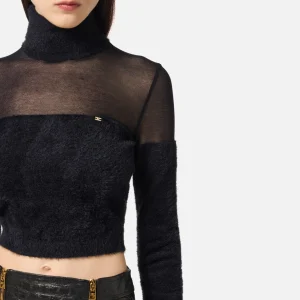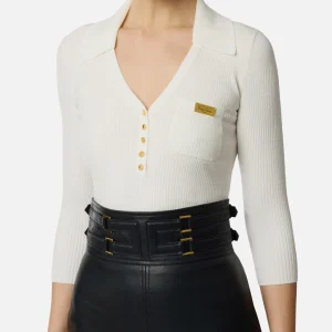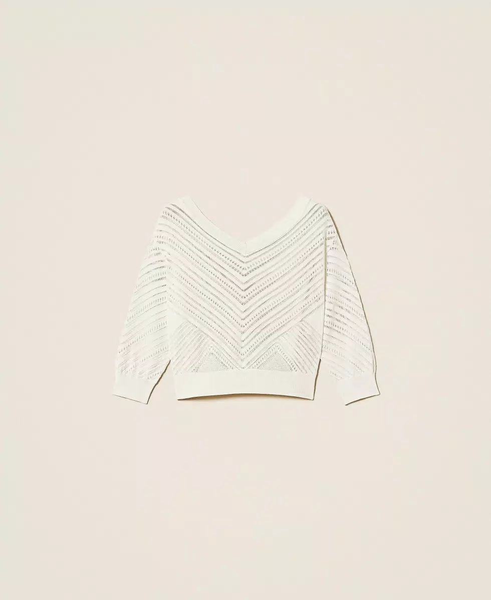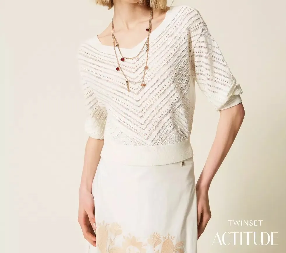 Maglia collezione Actitude in misto viscosa con tessitura punzonata a motivo chevron. Ha scollatura a V davanti e dietro, maniche a tre quarti, placchetta logo al fianco, linea dritta.