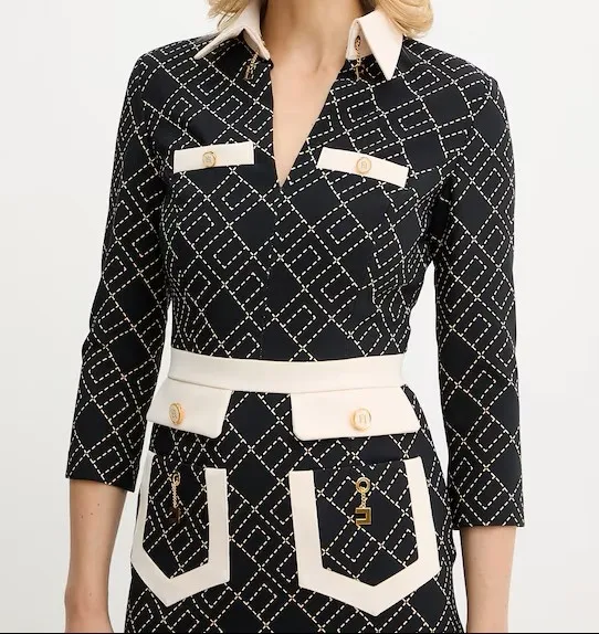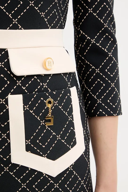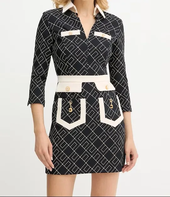 Look grafico per questo mini abito Elisabetta Franchi che abbina al design color block una stampa logo geometrica che crea un pattern ipnotico lungo tutta la silhouette. Maniche a tre quarti e scollatura a V con colletto.