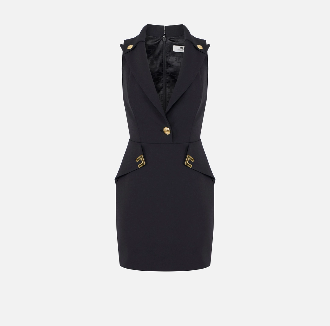 Mini abito in doppio crêpe stretch dalla vestibilità aderente. Il vestito è smanicato e ha top con spalline e rever a lancia. La gonna presenta alette laterali che disegnano una silhouette inedita. I bottoni e i dettagli smaltati con logo aggiungono note luminose al capo.