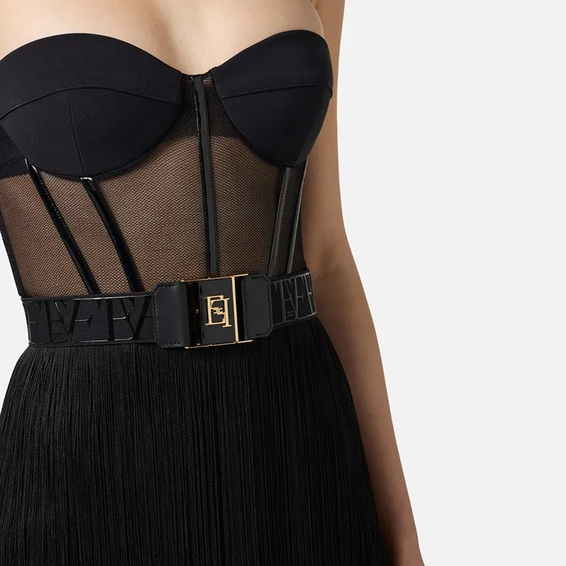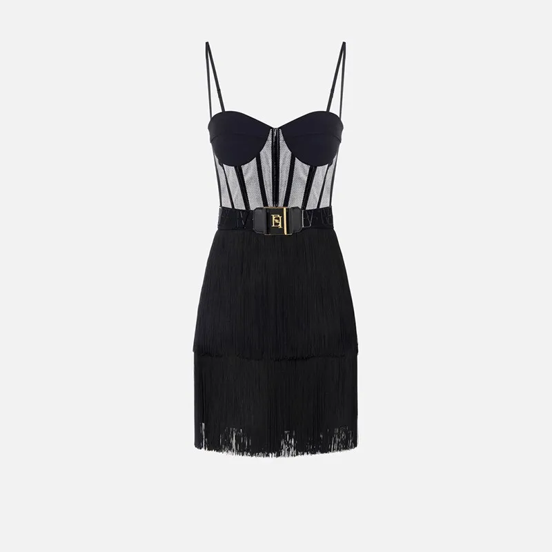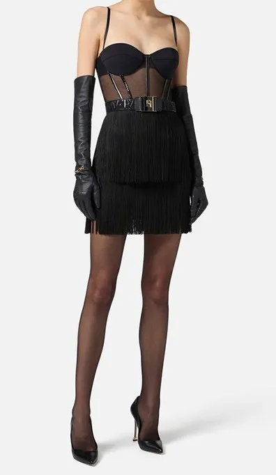 Mini abito in tulle dalla vestibilità aderente. Il vestito ha spalline, coppe, cintura con logo. Si distingue per i sensuali giochi di semi-trasparenza donati dalla costruzione a bustier, definita da dettagli in vinile. Protagonista è la gonna a doppia balza con frange, a regalare movimenti ipnotici.