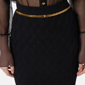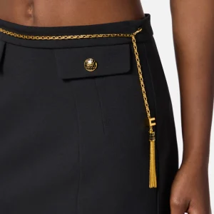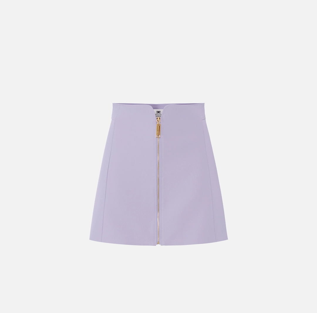 Gonna corta in doppio crêpe stretch. Ha vita bassa sagomata a cuore e linea ad A. È impreziosita dalla chiusura con zip in metallo dorato sul davanti e dal tirazip a forma di lucchetto. Vestibilità regular.