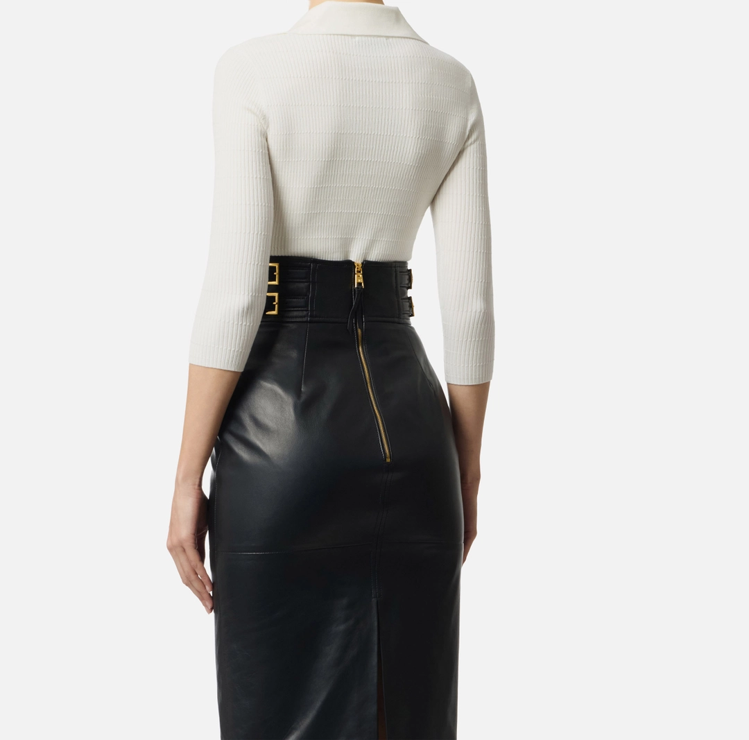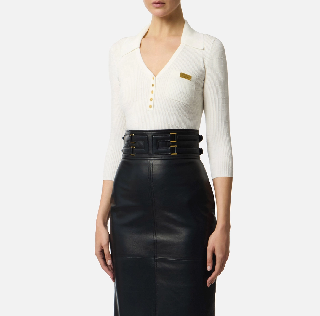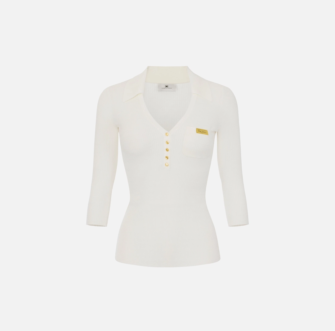 Polo in maglia a maniche lunghe. Si distingue per l’elaborata lavorazione: la trama è movimentata da costine a micro-trecce su tutta la lunghezza, creando un dinamico pattern tattile. I bottoni in metallo dorato e la placca con logo e lettering sul taschino illuminano il capo con luminosi dettagli di stile. Vestibilità aderente.