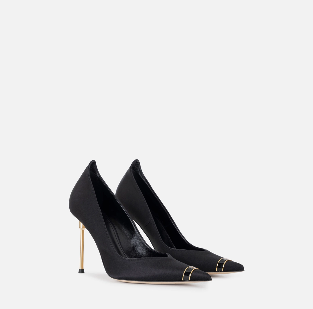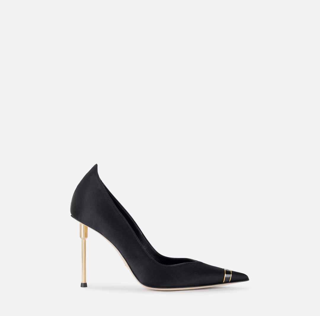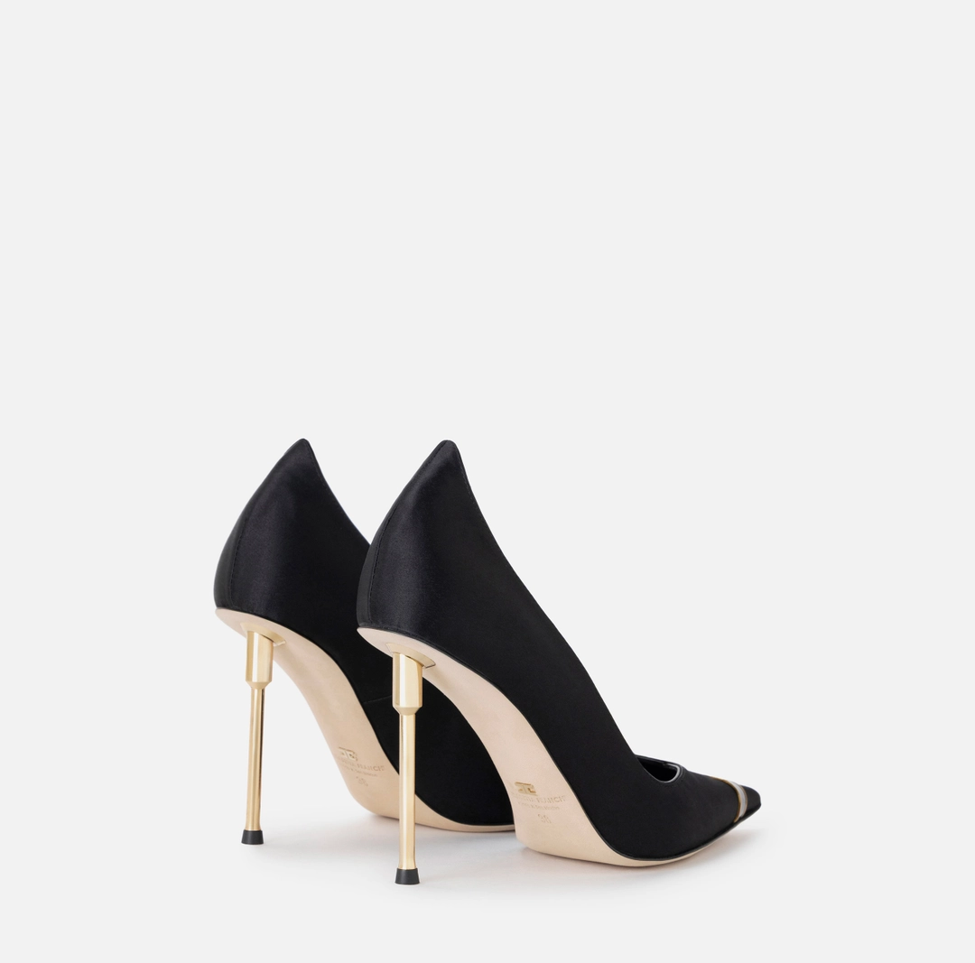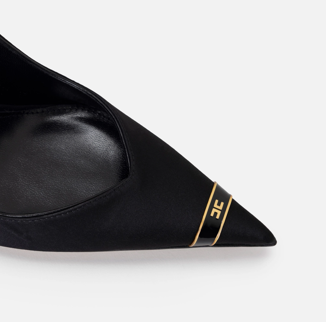 Pump dalla punta affusolata impreziosita dal davantino smaltato con logo. Il tacco scultura con finitura dorata slancia la figura e regala un tocco geometrico.