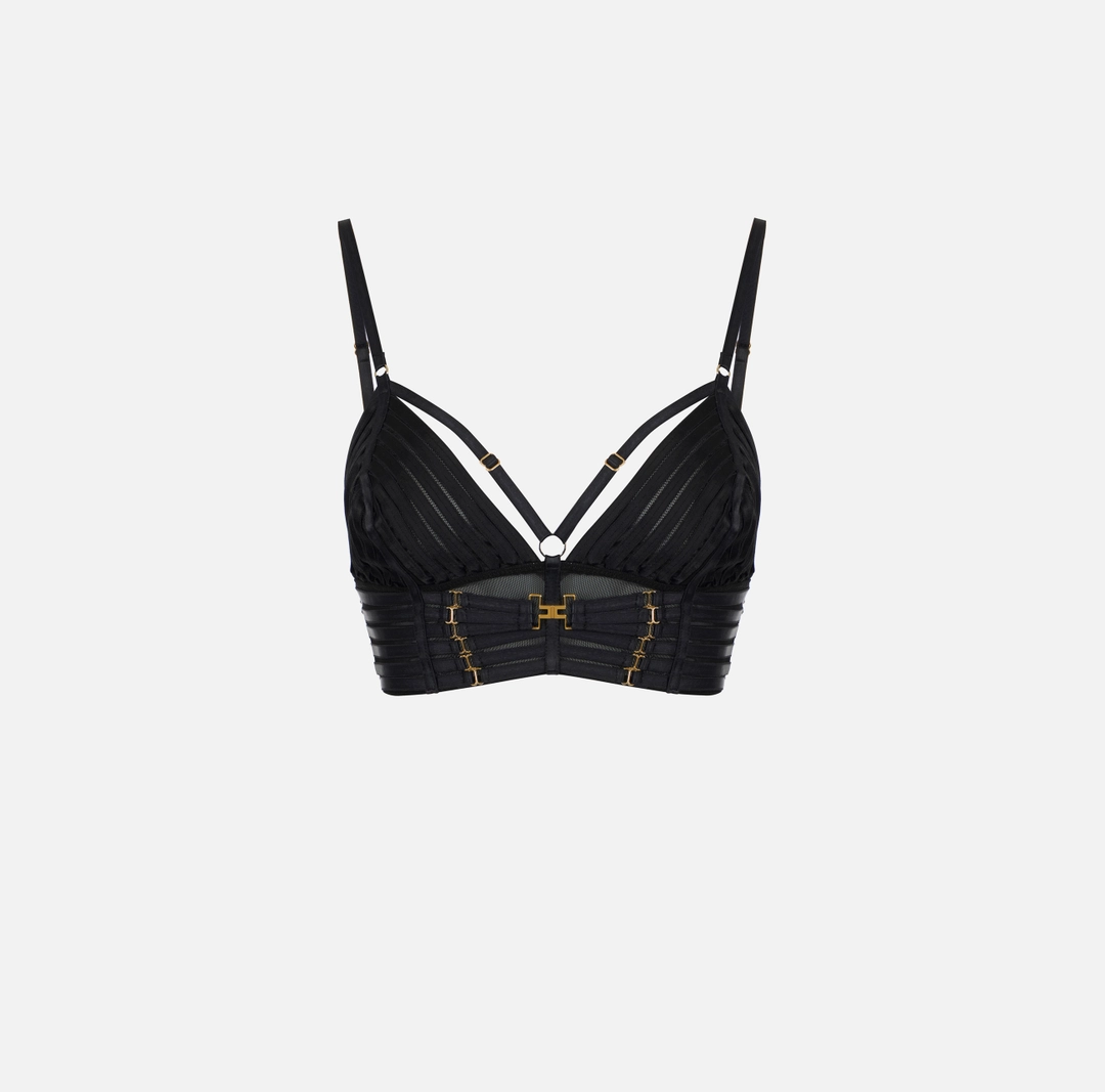 Reggiseno realizzato in tulle. Interamente decorato da elastici di ispirazione lingerie sul davanti e sul retro, con logo in metallo dorato ad aggiungere luce. Vestibilità aderente.