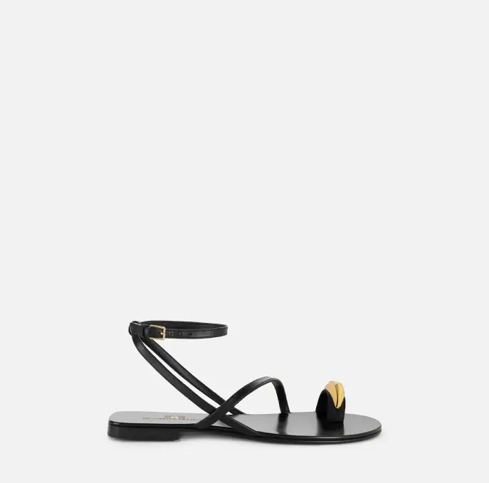 Sandali realizzati in pelle con cinturino alla caviglia. Con listini sottili ad avvolgere il piede, sono impreziositi dal dettaglio gioiello con logo.
