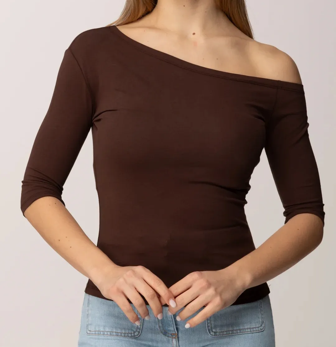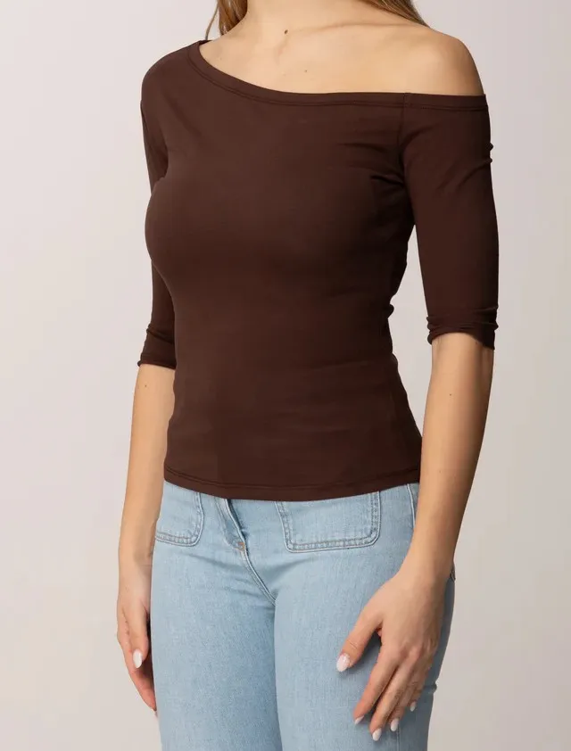 T-shirt collezione Actitude in jersey di cotone con collo asimmetrico, maniche lunghe al gomito, linea fitted.