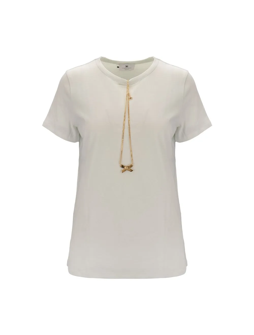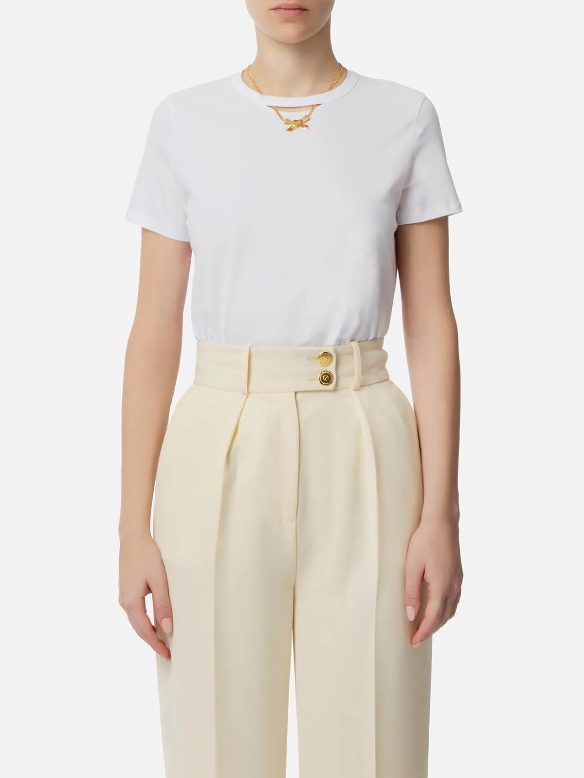 Maglietta a maniche corte in jersey di cotone con vestibilità slim. Il capo si distingue per lo scollo che lascia passare una collana in metallo dorato, arricchita dal dettaglio in tono a forma di fiocco con logo. Dettagli: Dettaglio in metallo dorato con fiocco