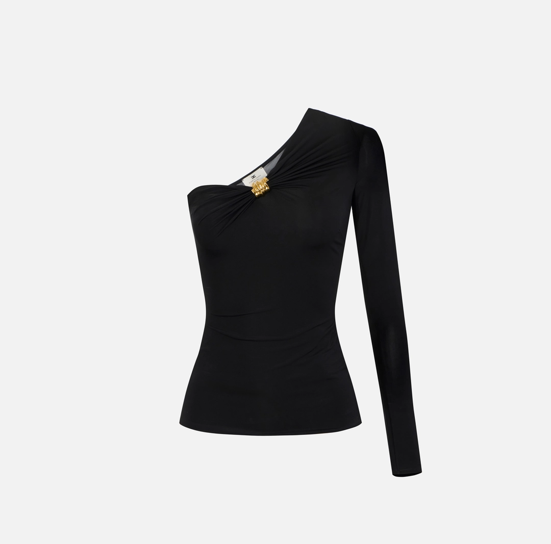 Top in jersey crêpe leggero con design monospalla e manica lunga. Si distingue per il dettaglio di fermanodo gioiello, a esaltare lo scollo e a trattenere il drappeggio sul davanti. Vestibilità aderente.