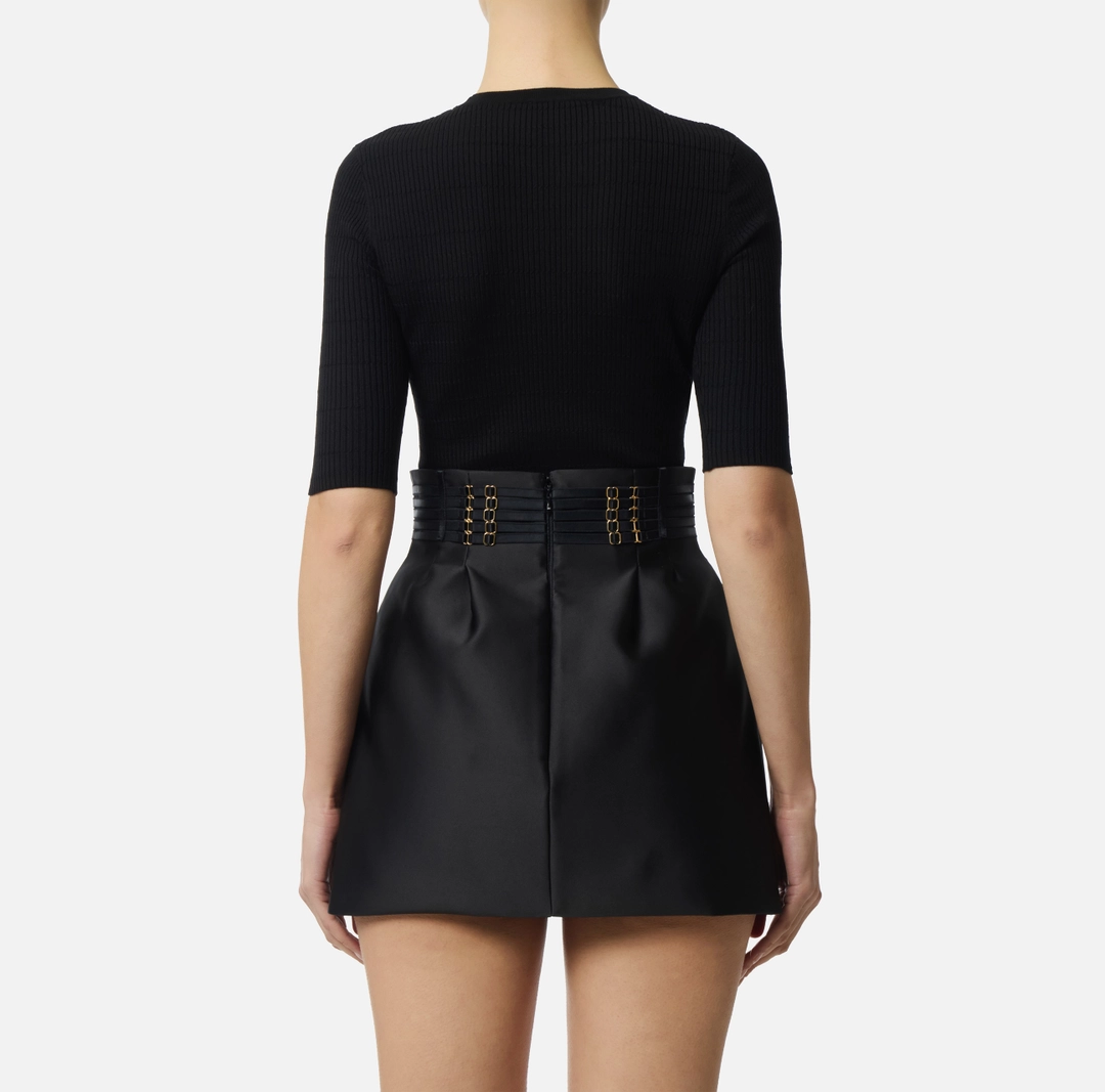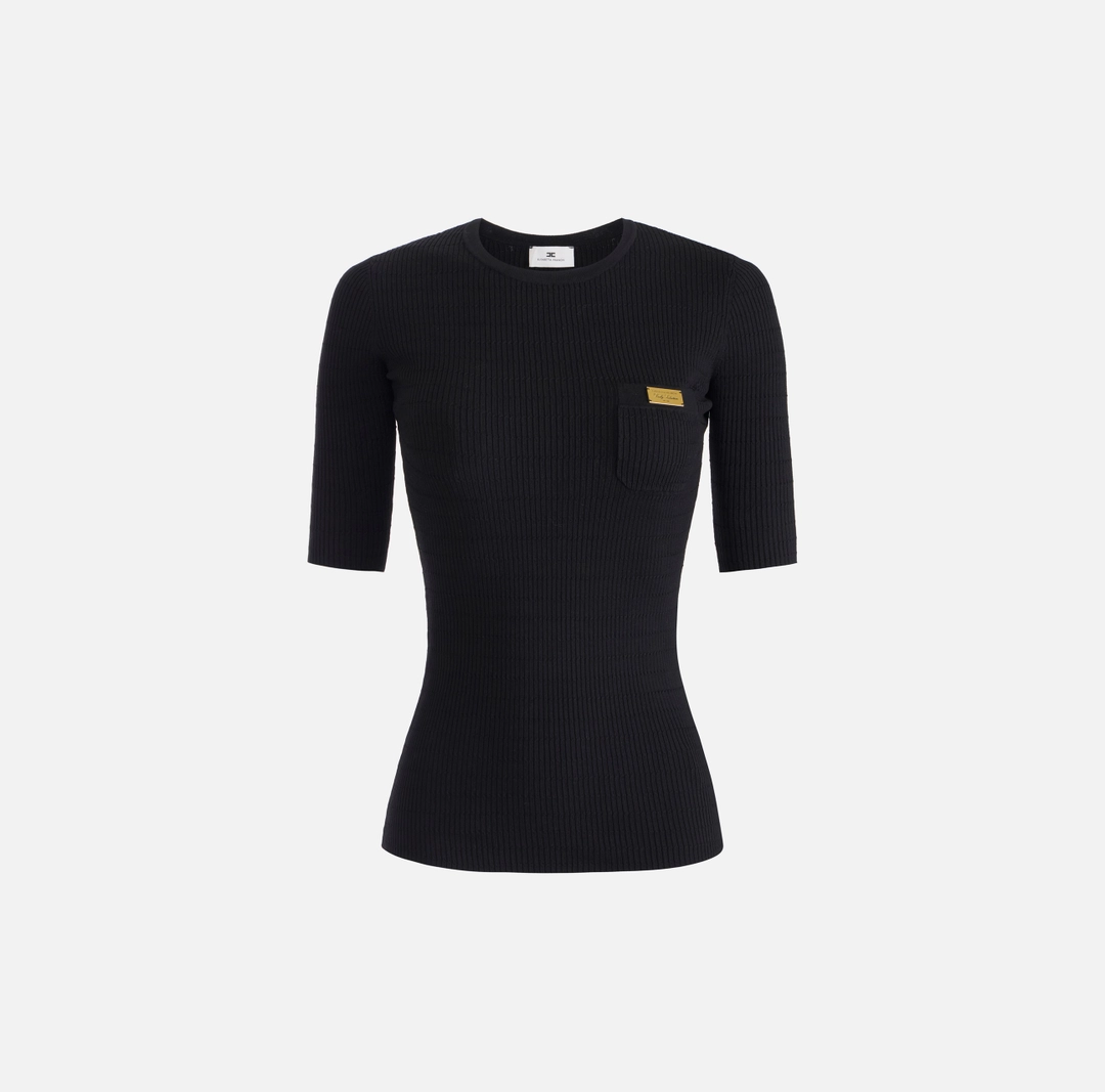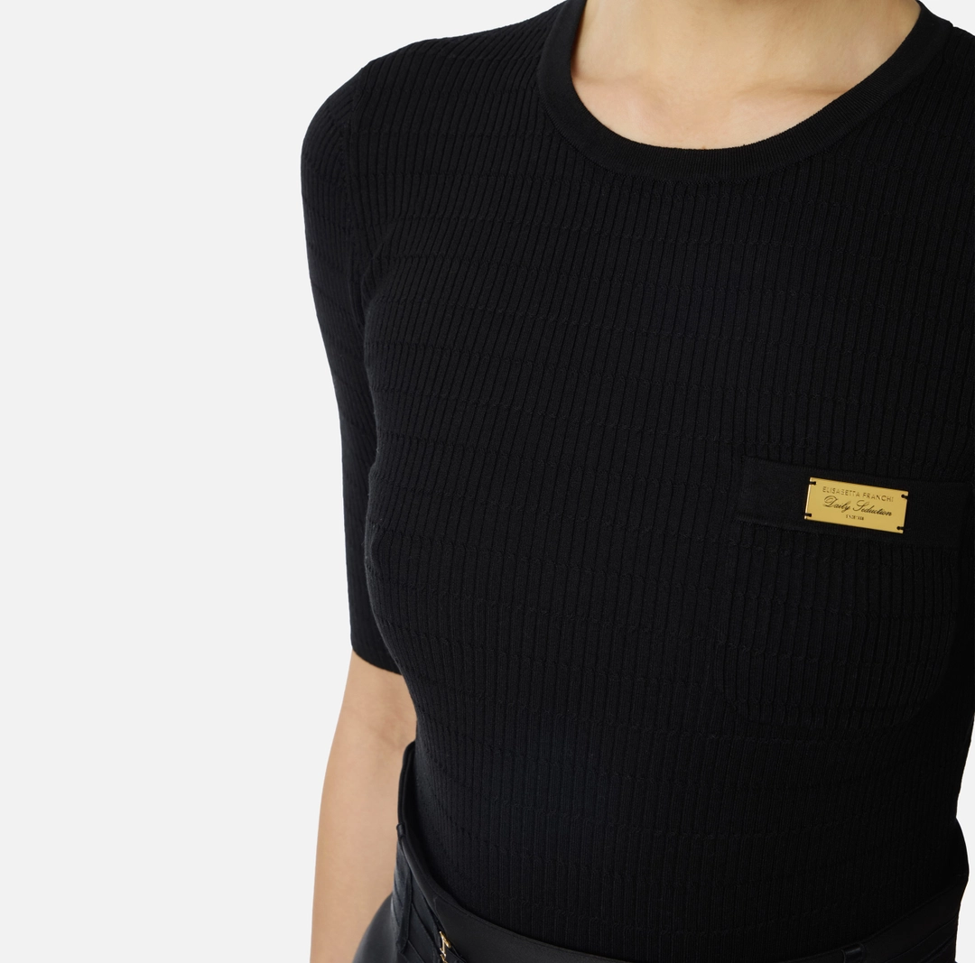 Top in maglia a maniche corte. Si distingue per l’elaborata lavorazione: la trama è movimentata da costine a micro-trecce su tutta la lunghezza, creando un dinamico pattern tattile. La placca con logo e lettering sul taschino illumina il capo con un luminoso dettaglio di stile. Vestibilità aderente.