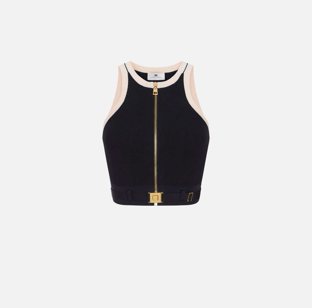 Top in maglia con scollo olimpionico. Si distingue per le bande in viscosa lucida e per i colori a contrasto che enfatizzano il design grafico del capo. La cintura in vita ha placca in metallo dorato con logo per un ultimo dettaglio di stile. La chiusura con zip e l’etichetta sul retro completano il capo. Vestibilità aderente.