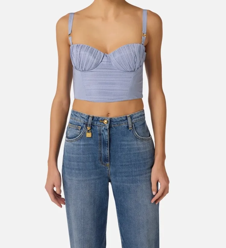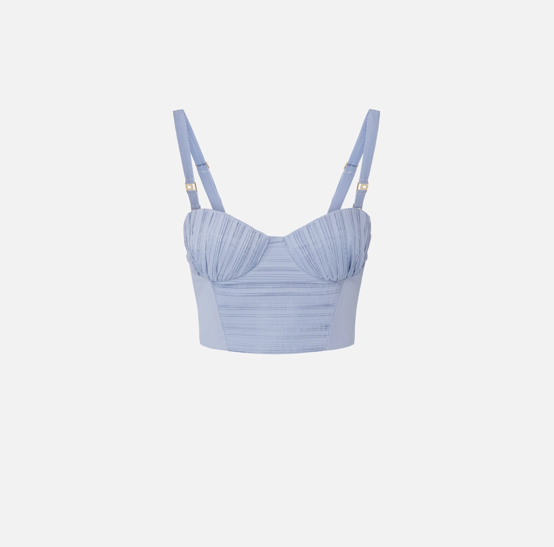 Top in taffettà di nylon con spalline e coppe. Si distingue per la stampa con pattern a righe, posizionata con andamenti asimmetrici e arricchita da pieghettature plissé per una dinamica leggerezza. Impreziosito da dettagli con logo. Vestibilità aderente.