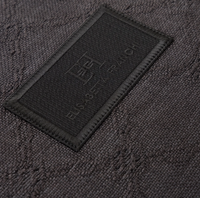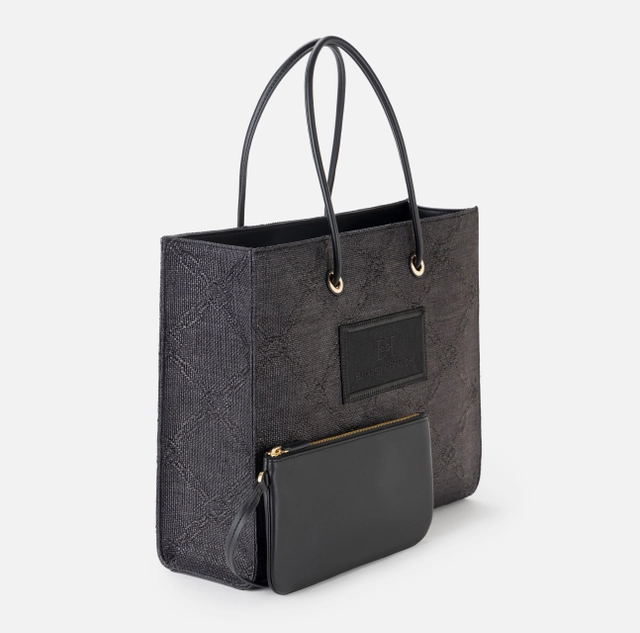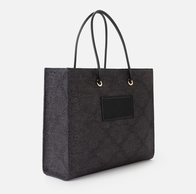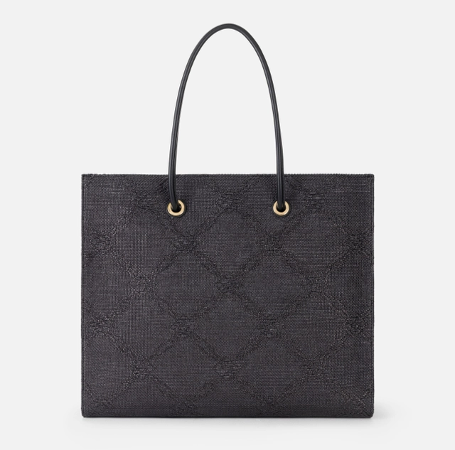 Borsa tote grande realizzata in rafia jacquard con disegno a losanghe, impreziosita da dettagli in metallo dorato per una nota di luce. Una patch con logo ricamato completa l’accessorio.