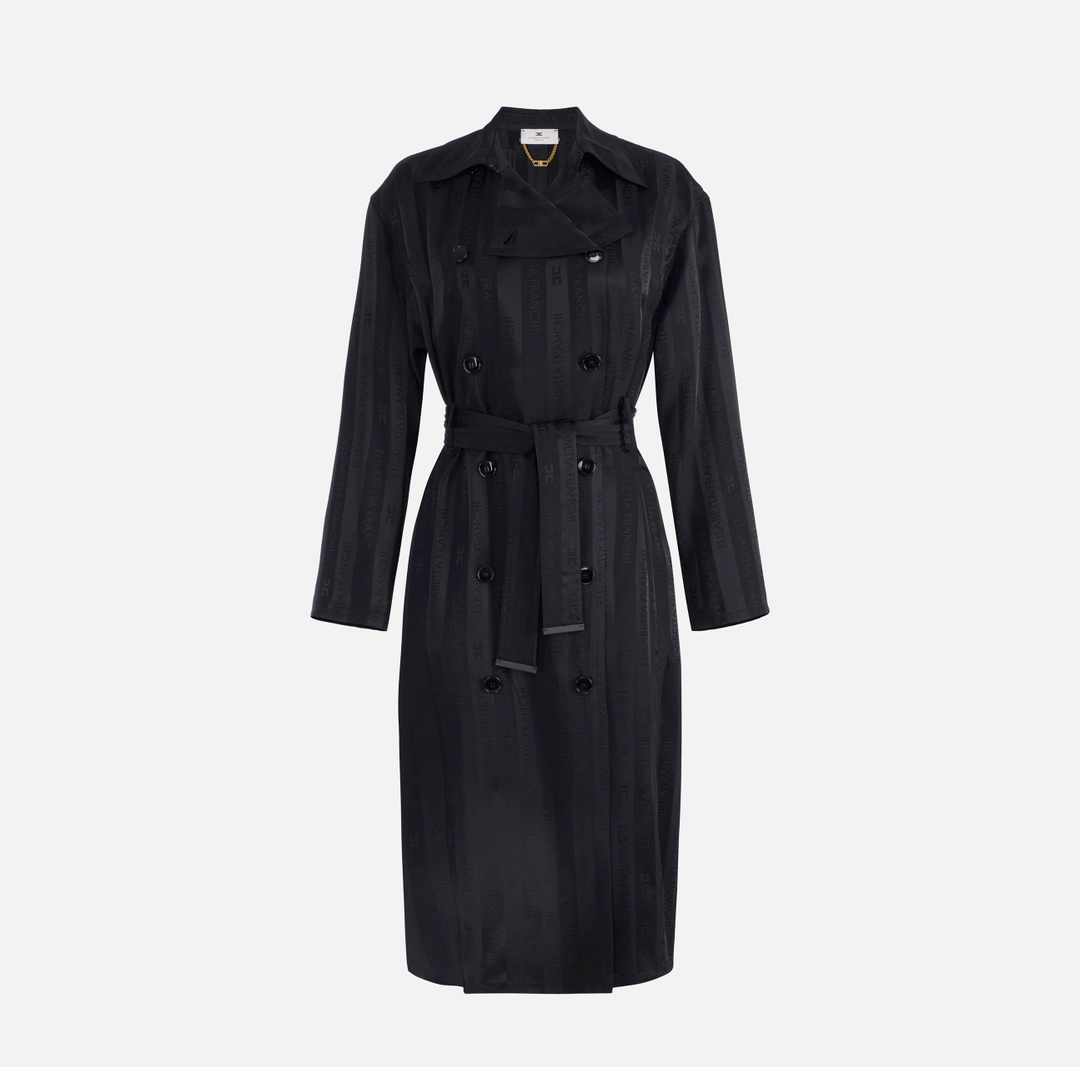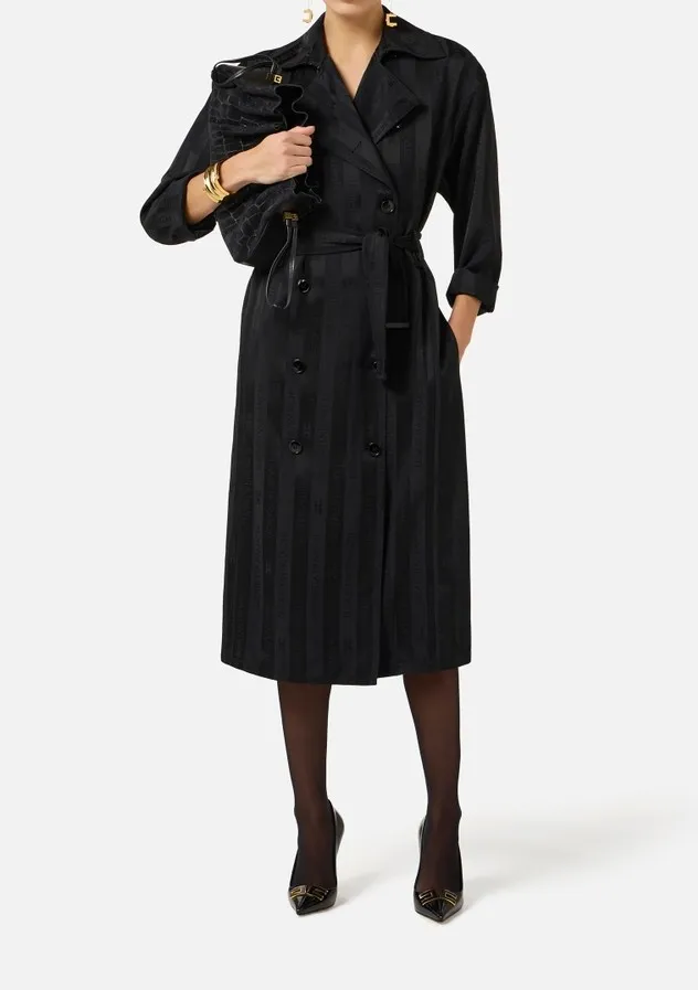 Trench in satin con chiusura doppiopetto, rever e cintura in vita. La lavorazione jacquard crea un pattern a righe che alterna texture lucide e opache, per un ritmo visivo e materico. Vestibilità regular.